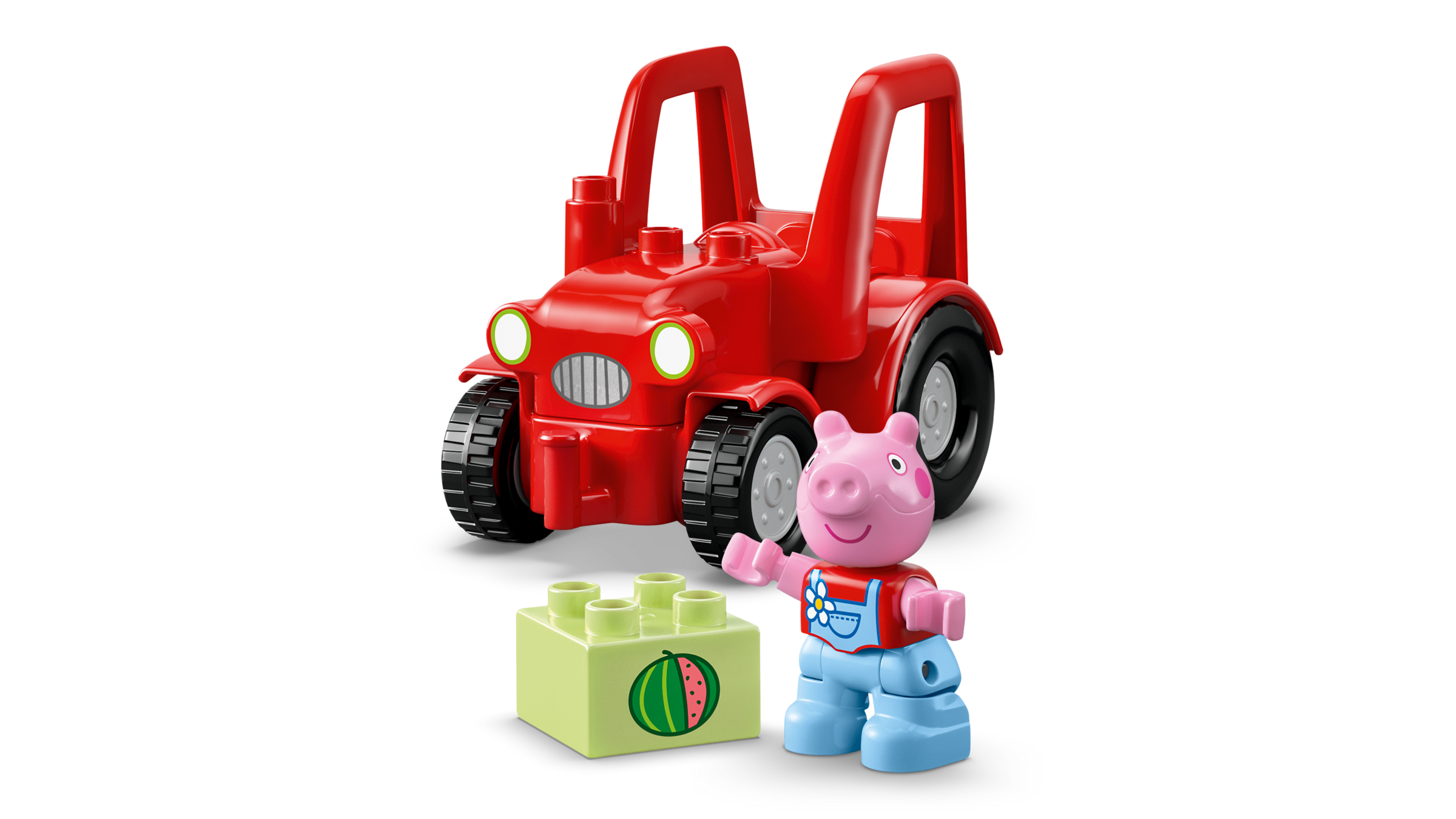 2 CHARAKTERE:Ein fahrbarer roter Traktor, Steine, auf denen Obst und Gemüse abgebildet ist, sowie die beiden Figuren Pedro Pony und Peppa lassen Kinder fantasievoll spielen
