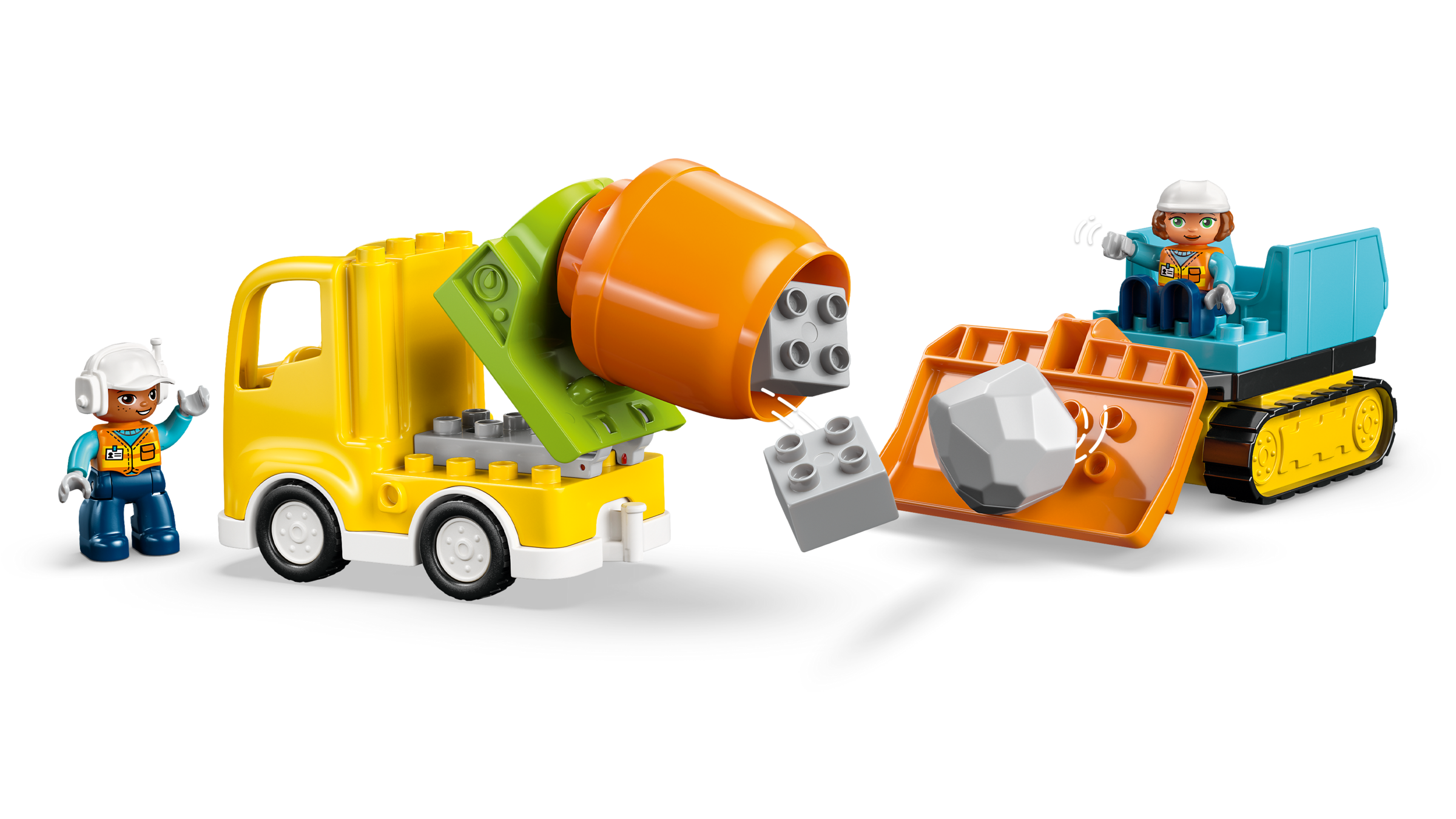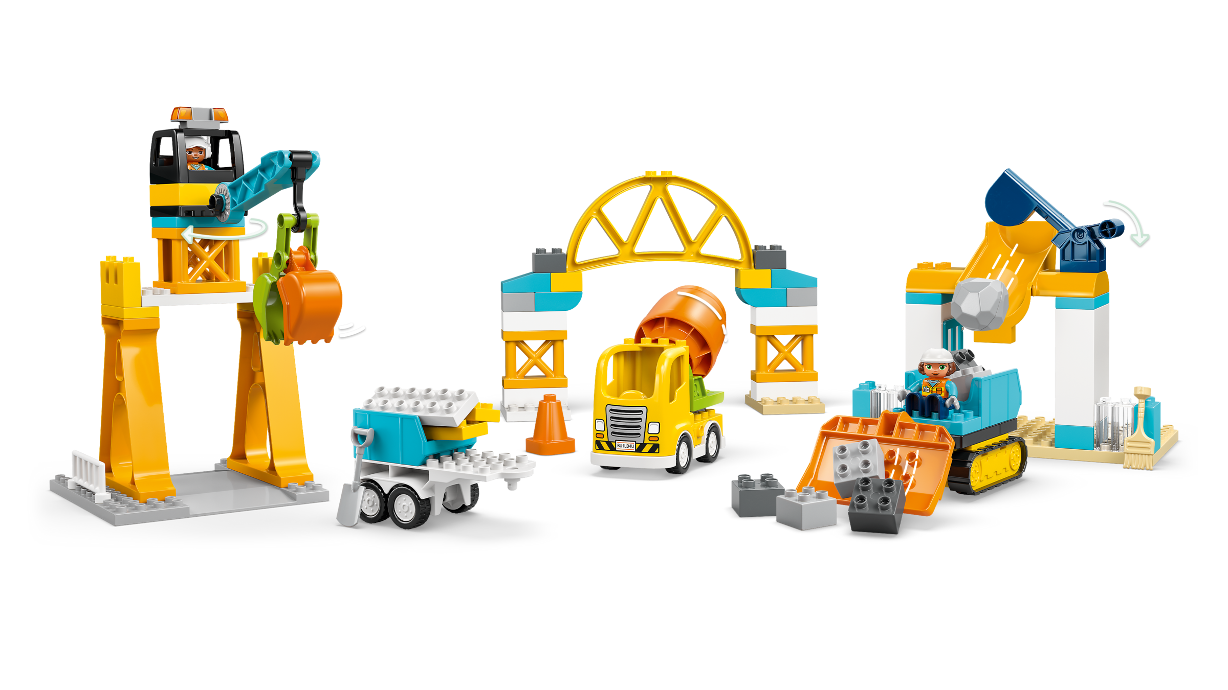 Kleinkinder können einen Bulldozer mit Schaufel, einen Kipplaster mit Kippfunktion, einen Betonmischer mit drehbarer Trommel und einen Kran mit Schaufel an dem bewe glichen Arm bauen. Die Bausteine lassen sich auch zu einem hohen Kran, einer Beladestation, durch die Laster rumpeln können, und einer Brücke, unter der die Fahrzeuge hindurchfahren können, zusammenfügen.