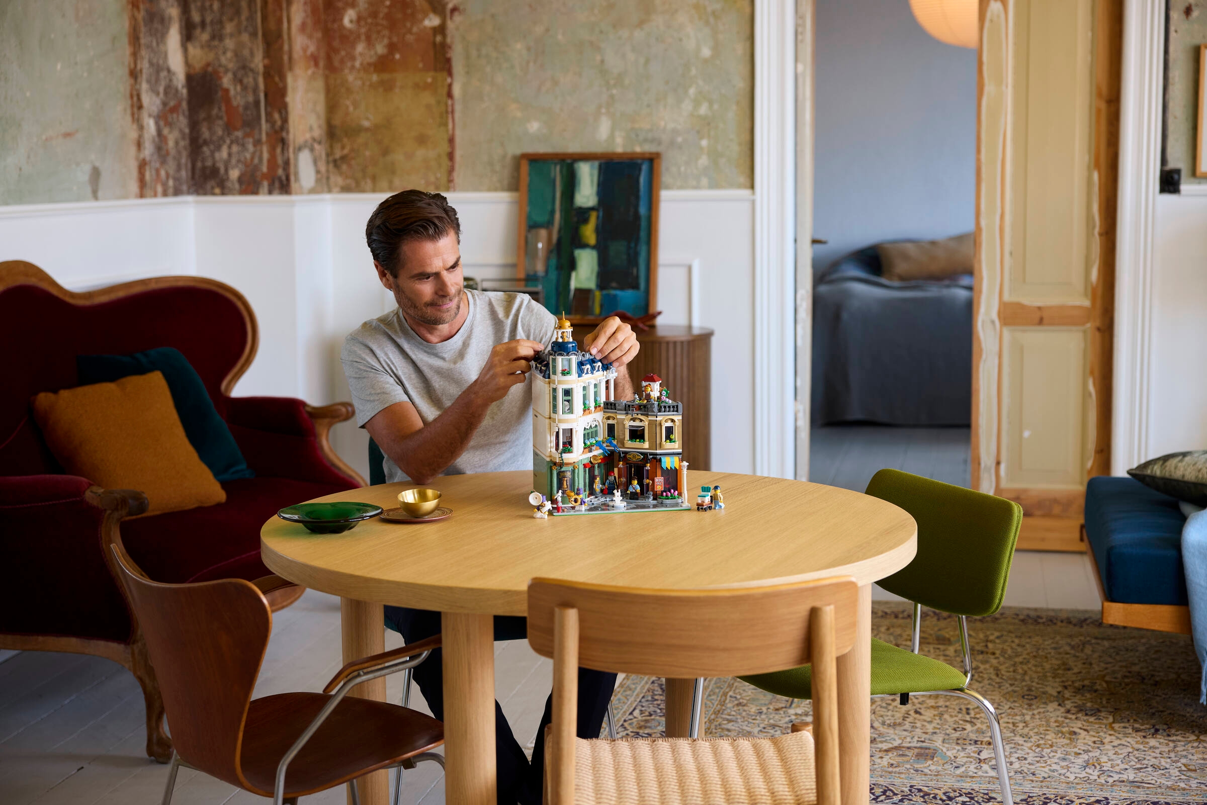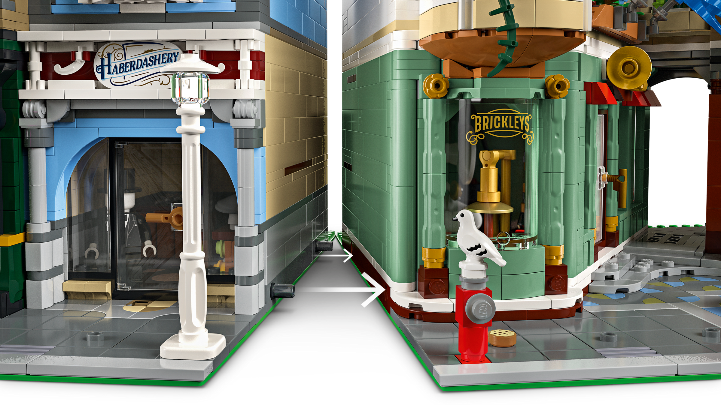 Das 3-geschossige Gebäude beherbergt einen 2-geschossigen Musikladen mit Instrumenten für Marschkapellen und das benachbarte Möbelgeschäft mit Ladentheke, Hockern, Tisch und Werkstatt. Im Dachgeschoss befindet sich eine möblierte Wohnung mit Badezimmer. Und der Dachgarten bietet Platz für Topfpflanzen und einen Taubenschlag. Dieses Modell mit 7 Minifiguren ist die perfekte Zimmerdeko fürs Wohnzimmer oder Büro. Dank des modularen Designs sind alle Räume gut zugänglich.