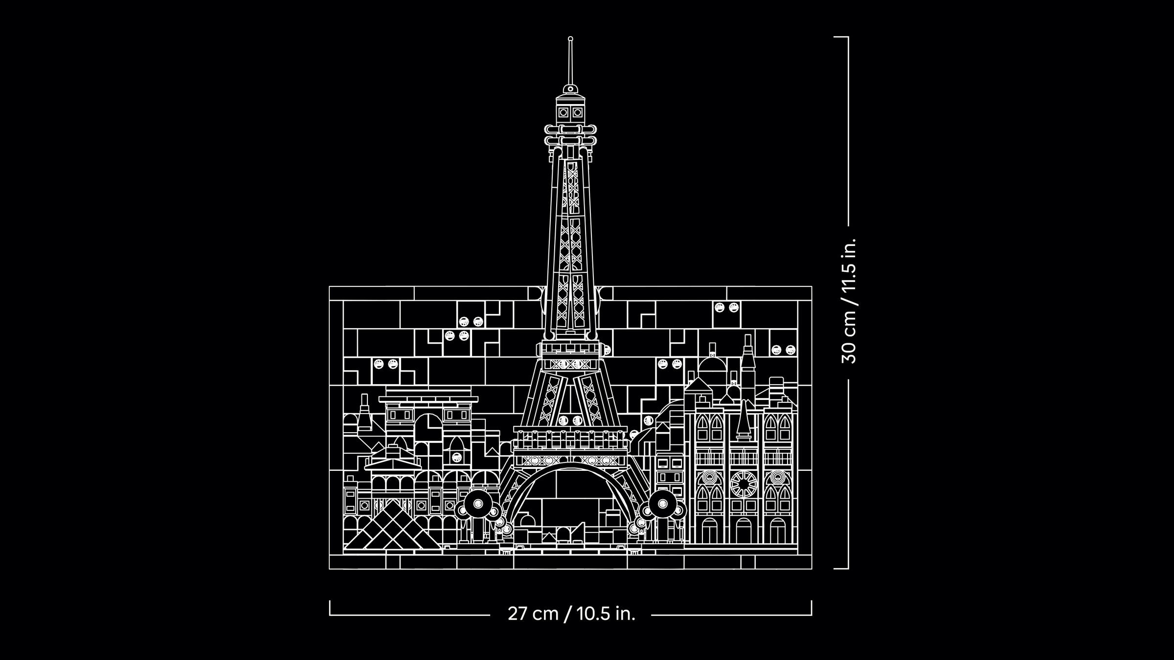 ABMESSUNGEN: Diese künstlerische Darstellung der Pariser Skyline ist 30 cm hoch, 27 cm breit und 5 cm tief. Das Set aus 958 Teilen lässt dich kreativ werden und abschalten