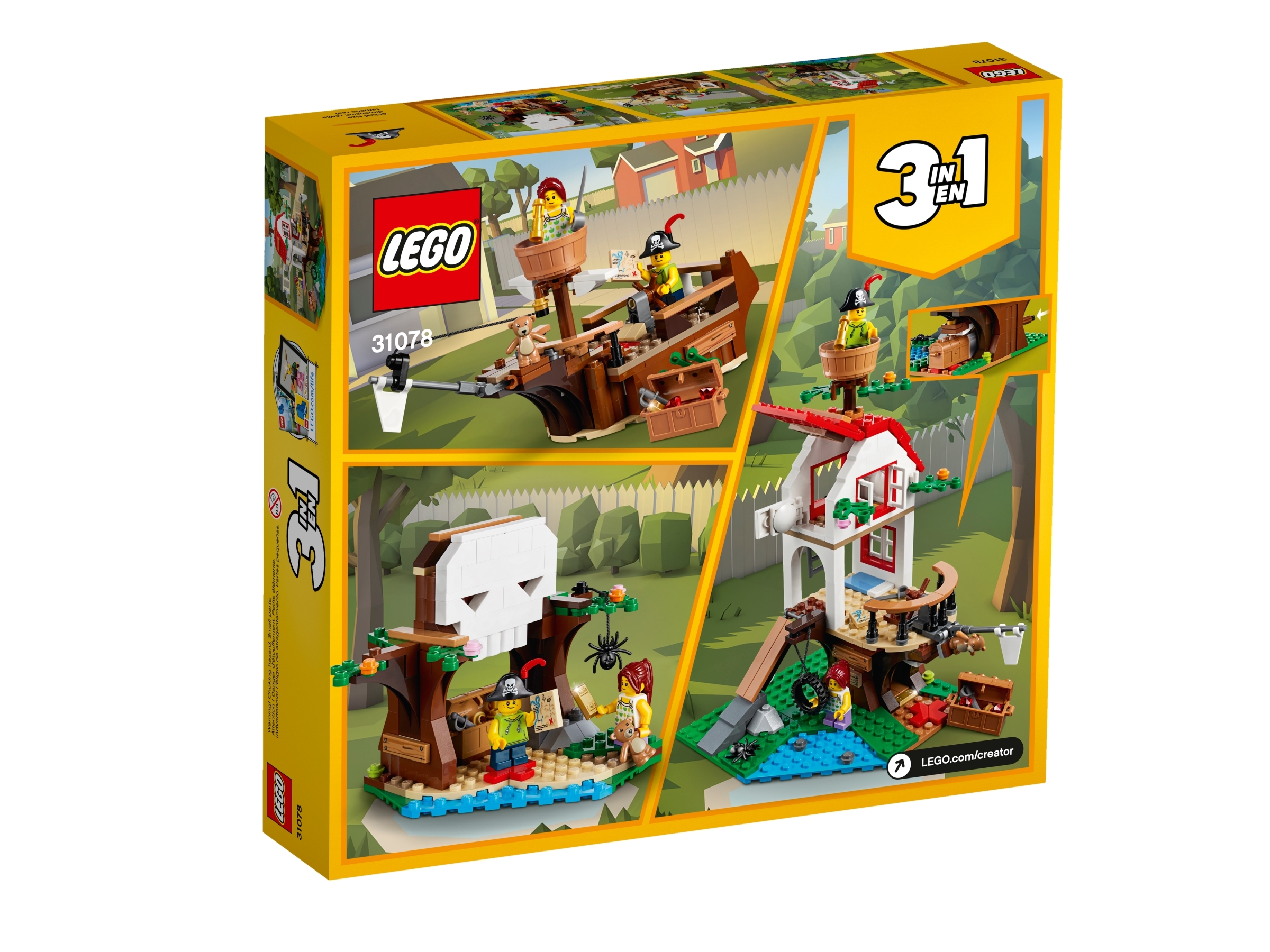 Das LEGO® Creator 3in1-Set „Baumhausschätze“ (31078) lädt zu fantasievollen Piratenabenteuern ein. Das Set enthält ein dreigeschossiges Piratenschiff-Baumhaus mit Schiffsdeck, Steuerrad, Versteckfunktion für eine Schatzkiste, Bugspriet mit Flagge und Teddybär, Ausguck, Reifenschaukel und Höhle im Obergeschoss. Als Piratenzubehör sind ein Hut, ein Fernrohr und 2 Schwerter enthalten. Dieses 3in1-Modell lässt sich auch in ein Piratenschiff oder eine Totenkopfhöhle umbauen, um noch mehr Piratenspaß zu erleben. Zum Set gehören 2 für Piratenabenteuer ausgerüstete Minifiguren sowie eine scheußliche Spinne als zusätzliche Tierfigur.