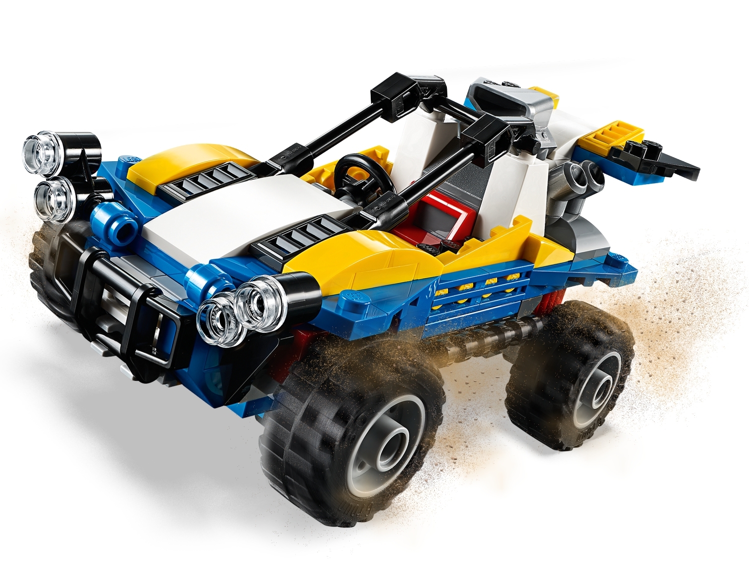 Rase mit dem LEGO® Creator Strandbuggy (31087) im farbenfrohen, sportlichen Design mit großen Reifen, Frontscheinwerfern, sichtbarem Heckmotor mit Luftansaugung, großem Heckspoiler und Auspuff sowie detailliertem Cockpit mit rotem Fahrersitz, Lenkrad und aufklappbarem Überrollkäfig über unwegsames Terrain. Die LEGO Creator 3-in-1-Sets bieten dir drei verschiedene Bau- und Spielerlebnisse. Nachdem du den Spielzeug-Strandbuggy gebaut hast, kannst du ihn für noch mehr Highspeed-Action und Abenteuer in ein Spielzeug-Flugzeug oder ein Spielzeug-Quad umbauen.
