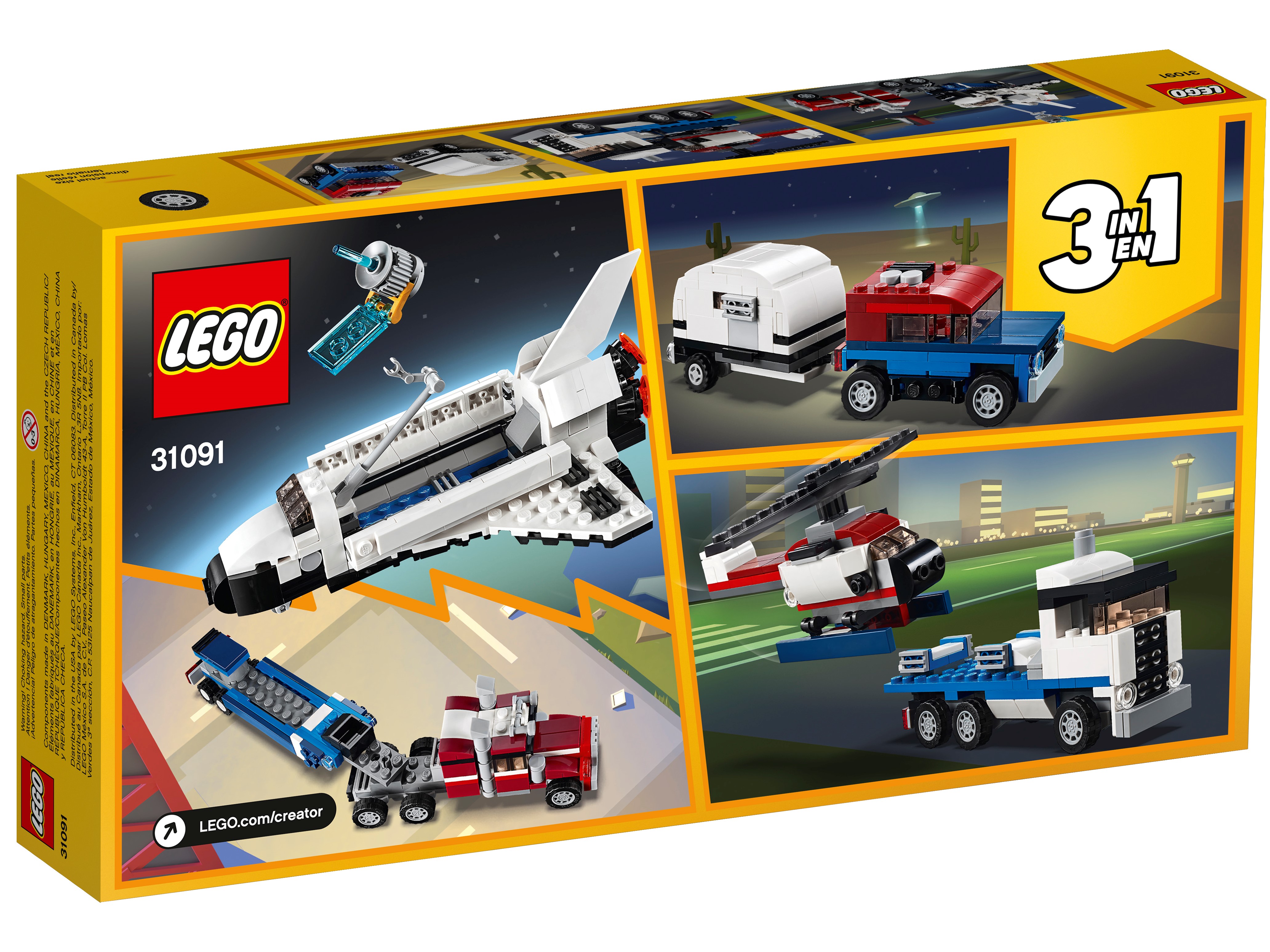 Es ist höchste Zeit, mit dem starken LEGO® Creator 3-in-1-Set „Transporter für Space Shuttle“ (31091) zum Startplatz zu fahren. Das Set enthält einen Tieflader mit Anhänger, vertikalen Auspuffrohren, auf dem Dach montierten Hupen, getönter Windschutzscheibe und 10 robusten, großen Reifen sowie ein Spielzeug-Space Shuttle mit großen Triebwerken, aufklappbaren Nutzlastluken, funktionierendem Kran und einen Satelliten. Die LEGO Creator 3-in-1-Sets bieten dir drei verschiedene Bau- und Spielerlebnisse. Nachdem du den Transporter für das Space Shuttle gebaut hast, kannst du ihn für noch mehr lustige Abenteuer in einen Spielzeug-Helikopter-Transporter oder ein Auto mit Wohnwagen umbauen.