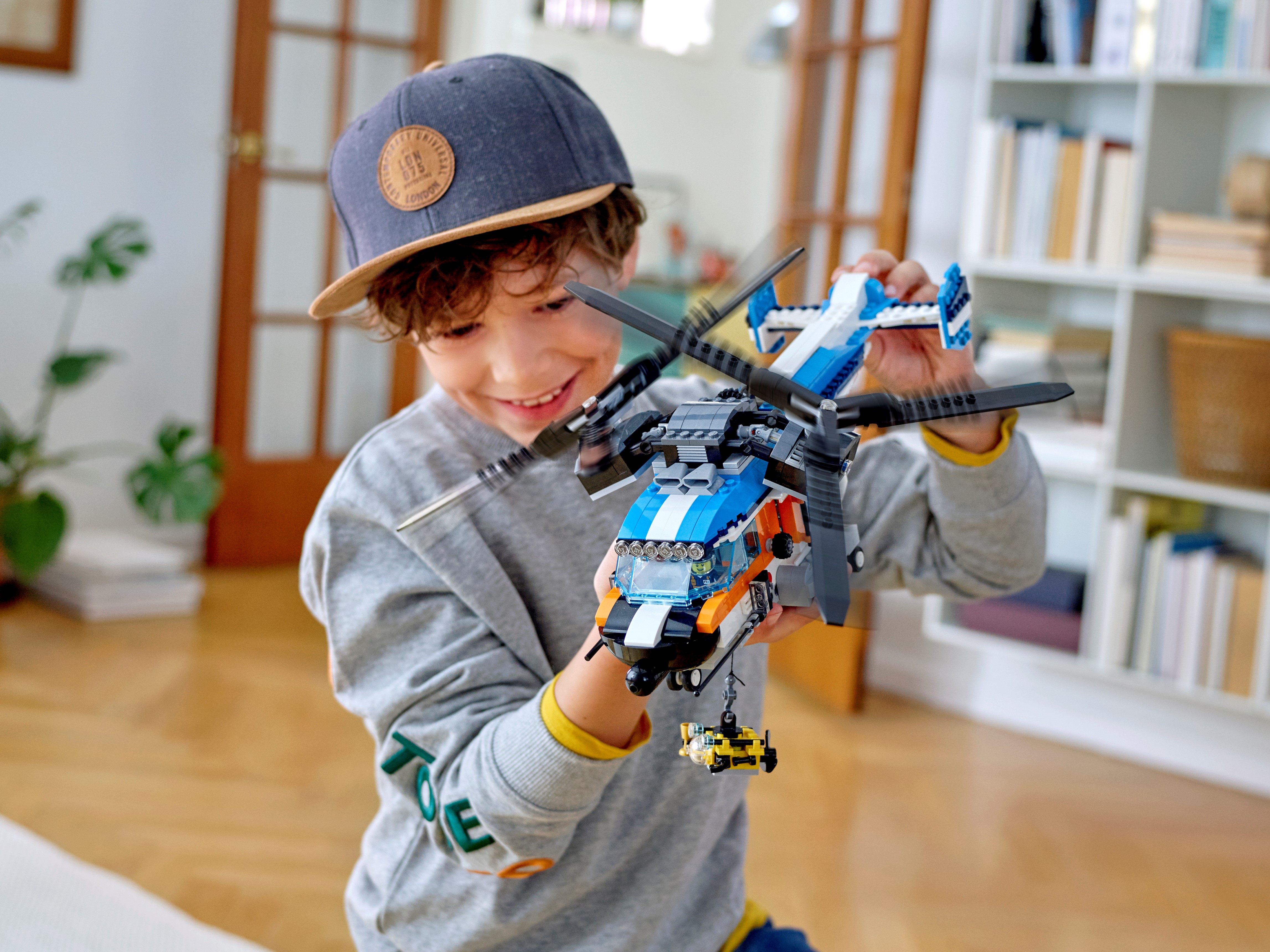 Dieses LEGO® Creator 3-in-1-Set bietet 3 verschiedene Baumöglichkeiten: Baue einen Doppelrotor-Hubschrauber, einen Spielzeug-Jet oder ein Luftkissenboot und erlebe packende Action bei maximaler Geschwindigkeit.