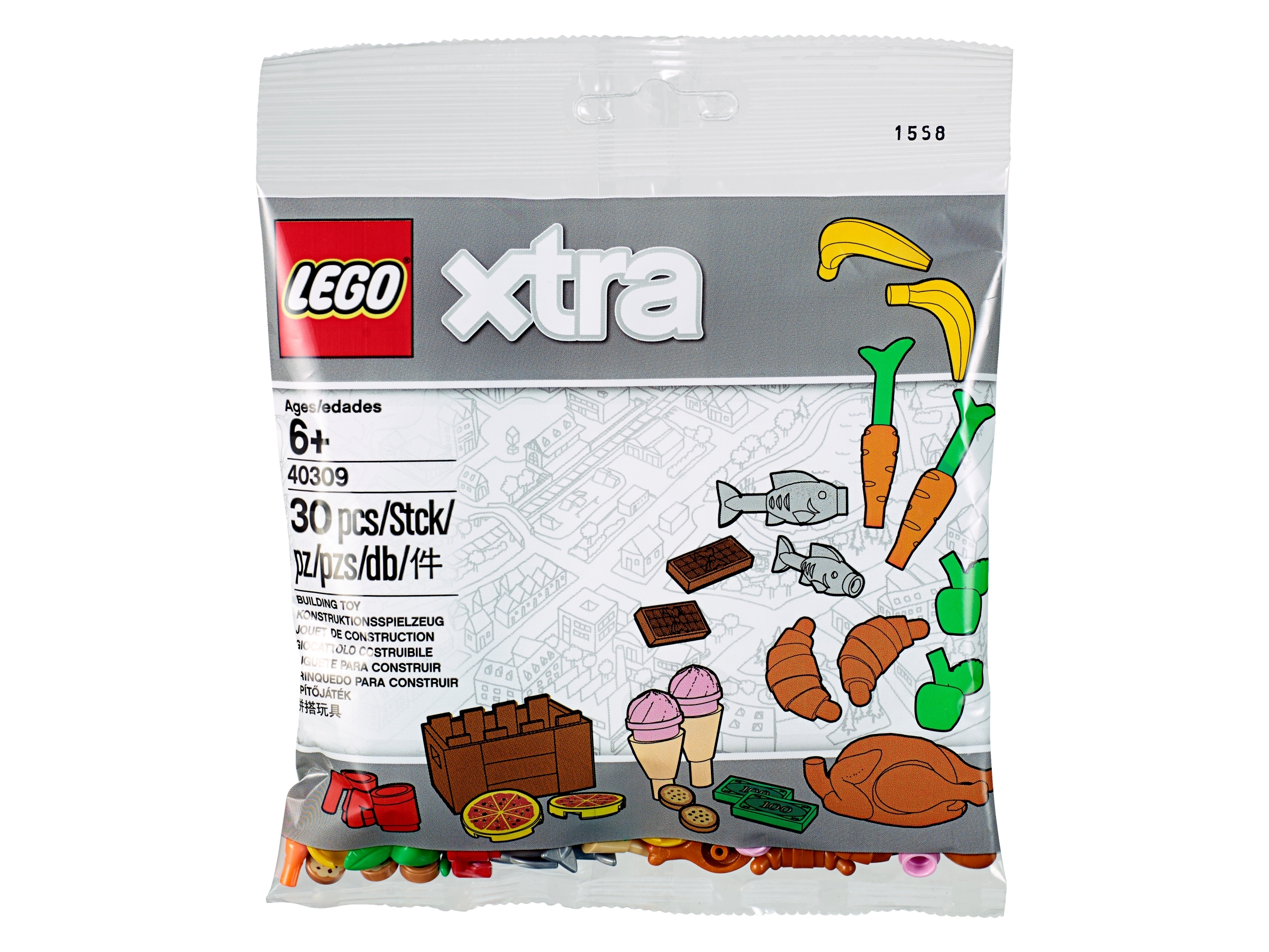 Das LEGO® Speisenzubehör (40309) enthält genau das Richtige, um dir neue Spielmöglichkeiten zu bieten, bei denen auch das Schlemmen nicht zu kurz kommt! Das Set enthält verschiedene Lebensmittel, unter anderem einen Truthahn, Croissants, Eiswaffeln, Obst, Gemüse und verschiedene Süßigkeiten. Außerdem gibt es eine Kiste und Geldscheine. Dieses LEGO Extra-Zubehör lässt sich mit allen LEGO Sets kombinieren, damit die Kinder alles spielen können, was sie sich vorstellen.