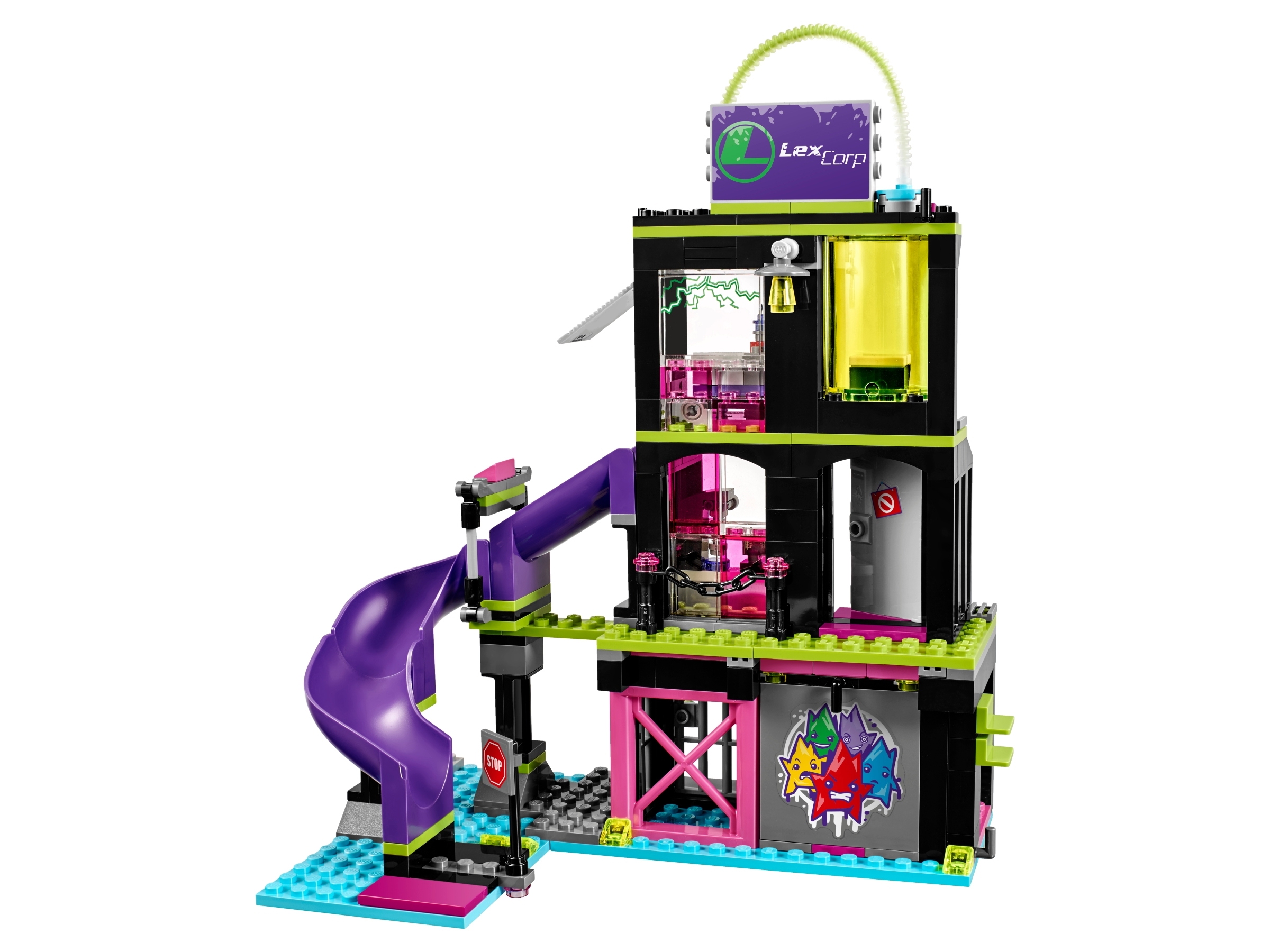 Enthält eine dreigeschossige Fabrik mit Labor, Gefängniszelle, Kristallelement, Kryptomite™-Automat/Rutsche, einem Raum zum Aufsaugen von Superkräften, einer Ausbruchstür mit Graffiti und einen Kryptomite-Shooter.