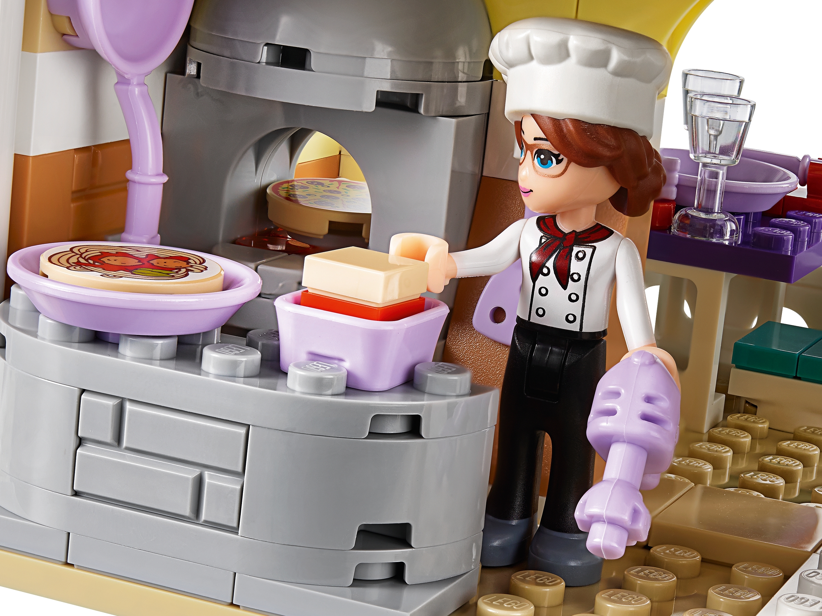 Das LEGO® Friends Restaurant ist mit einem Pizzaofen, einem Empfangsbereich, einem Essbereich auf dem Balkon, einer Küche, einem WC, einem Müllcontainer und einem Sitzbereich im Freien ausgestattet.