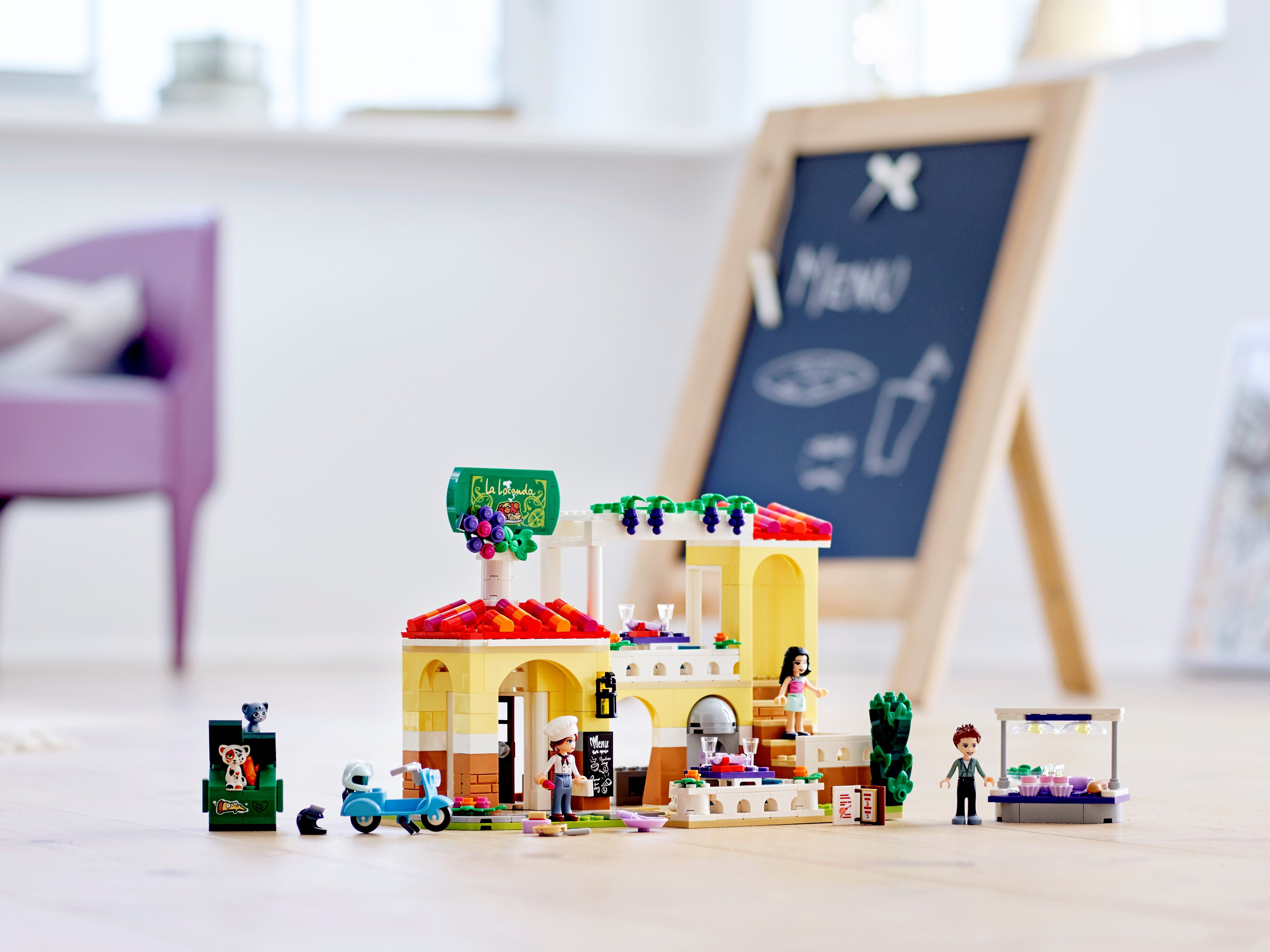 Das Restaurant-Spielset umfasst ein zweistöckiges Restaurant, einen LEGO Roller und einen separaten Salatwagen.