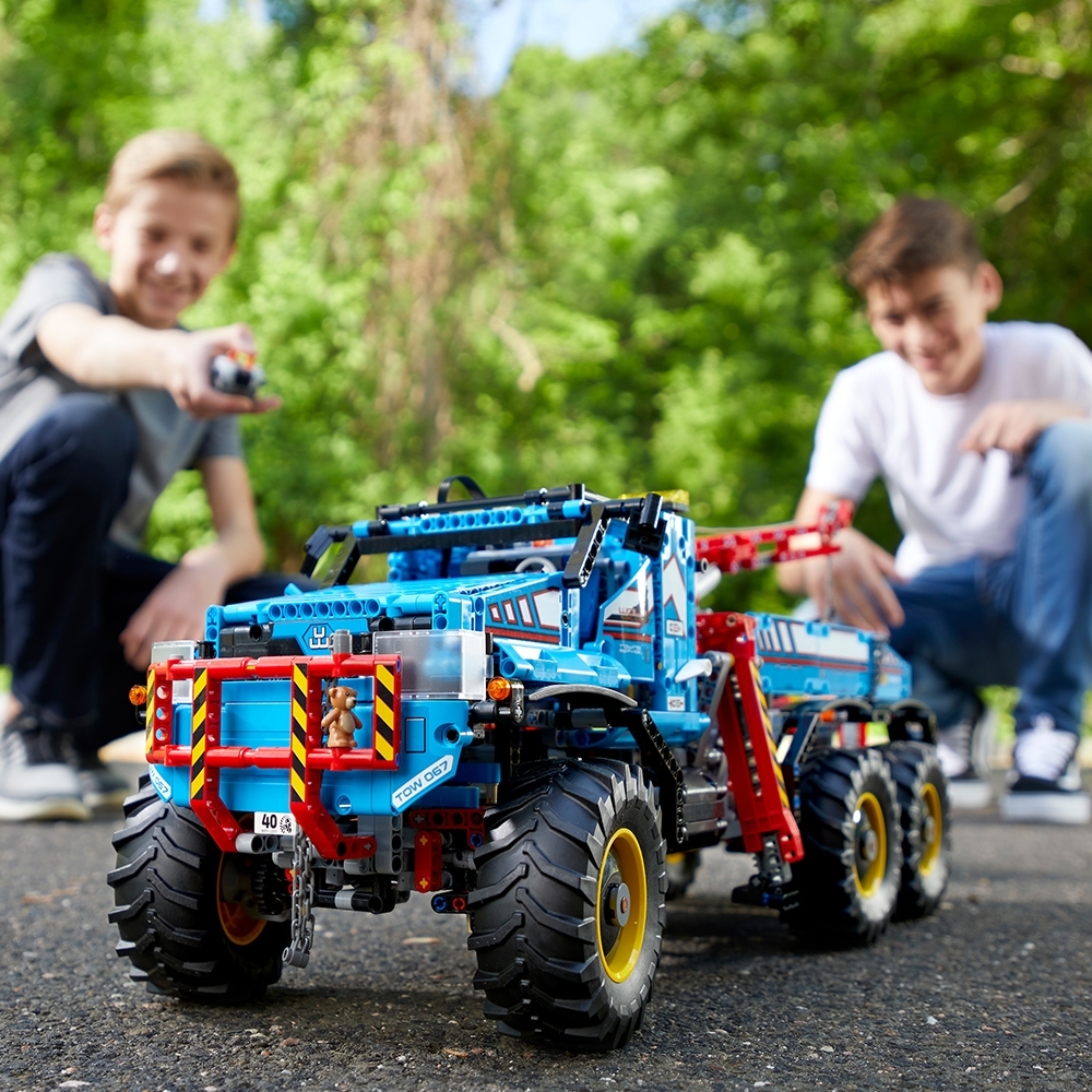 Mit dem ferngesteuerten Allrad-Abschleppwagen kannst du liegengebliebene Fahrzeuge bergen. Dieses authentische LEGO® Technic 2-in-1-Modell besitzt eine Lackierung in leuchtendem Blau, Rot, Gelb und Schwarz und verfügt über gewaltige grobstollige Reifen, einen äußerst robusten Frontschutzbügel mit Kette und Haken, bewegliche Scheinwerfer und ein detailreiches Fahrerhaus mit aufklappbaren Türen. Mit der Fernsteuerung kannst du das Modell vorwärts- und rückwärtsfahren lassen und lenken, die Stützfüße ausfahren und den Kran und die Seilwinde bedienen. Dieses Modell kann in ein Forschungsfahrzeug umgebaut werden, um doppelten Bau- und Spielspaß zu bieten!