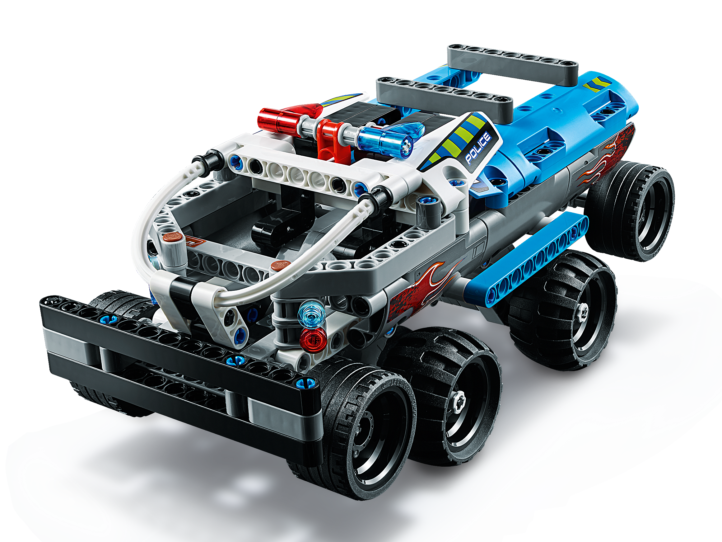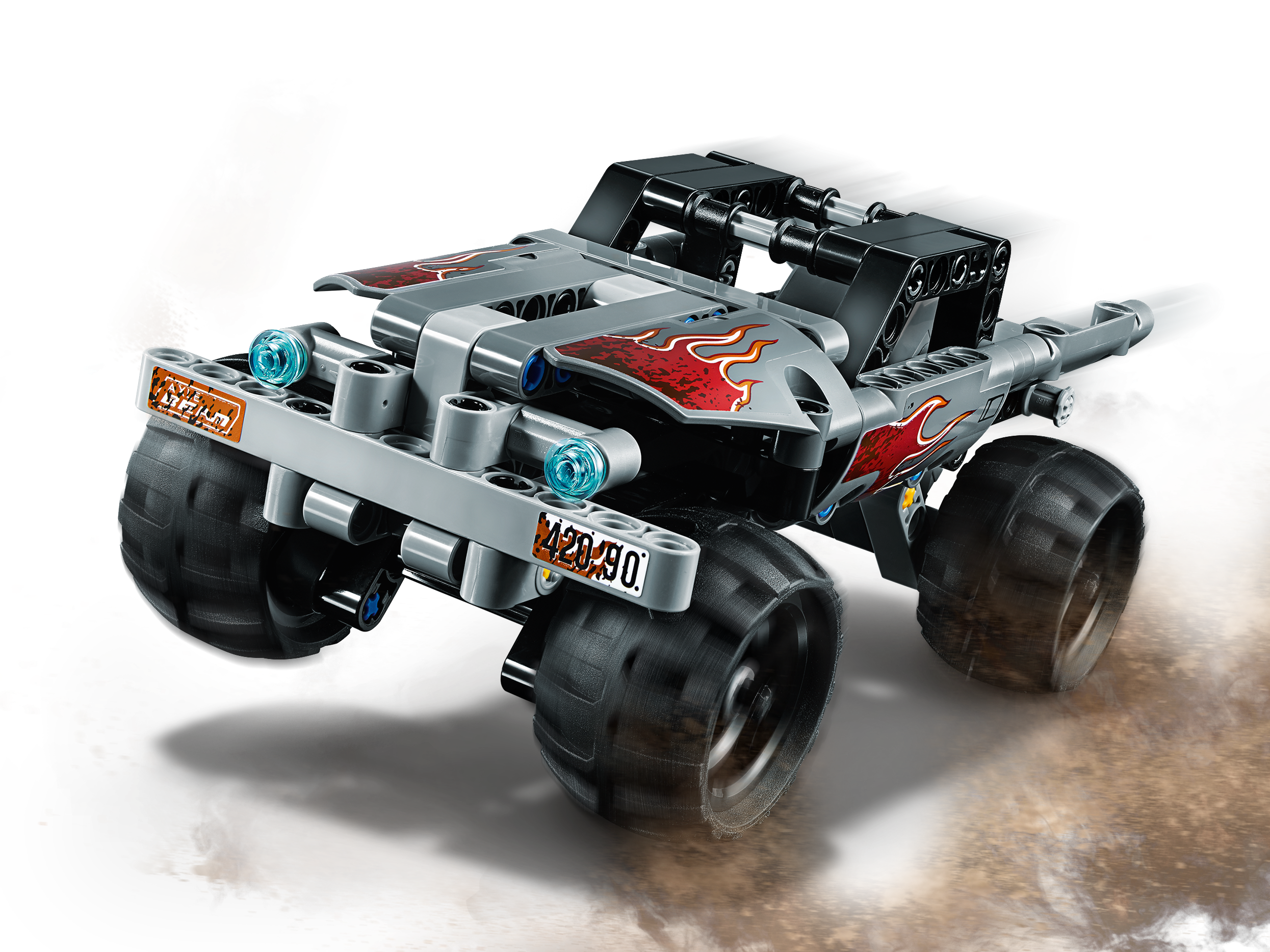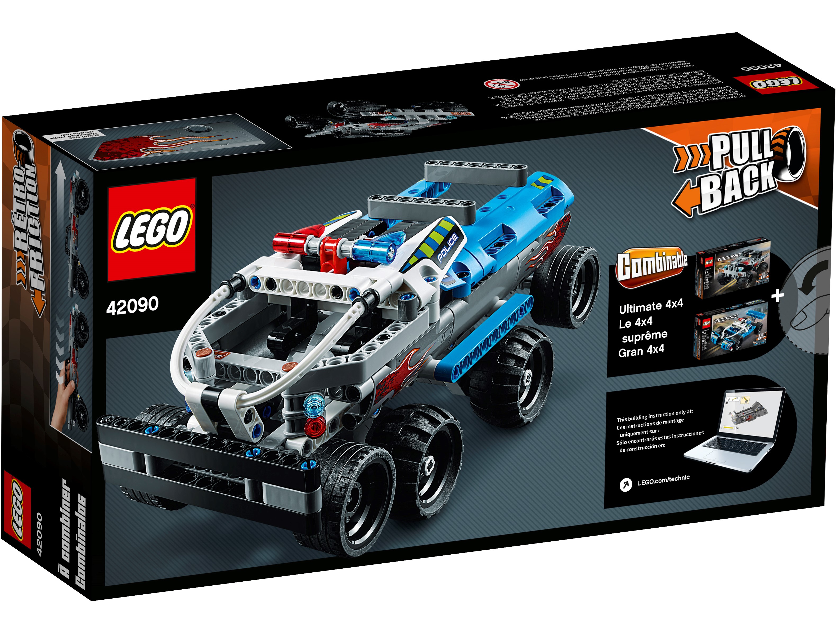 Genieße rasend schnelle Action mit dem LEGO® Technic Fluchtfahrzeug (42090)! Das Modell ist robust konstruiert und hat extrabreite Felgen mit riesigen Breitreifen, zwei große seitliche Auspuffrohre, eine schwere Frontstoßstange sowie ein Farbmuster in Rot, Grau und Schwarz mit Flammenaufklebern für einen knallharten Bösewicht-Look. Dieses robuste Truck-Modell ist zudem mit einem leistungsstarken Rückziehmotor ausgestattet. Kombiniere das Set mit dem Modell Polizei-Verfolgungsjagd (42091) mit Rückziehmotor, um actiongeladene Verfolgungsjagden nachzuspielen oder das Ultimate 4x4-Kombimodel zu kreieren.
