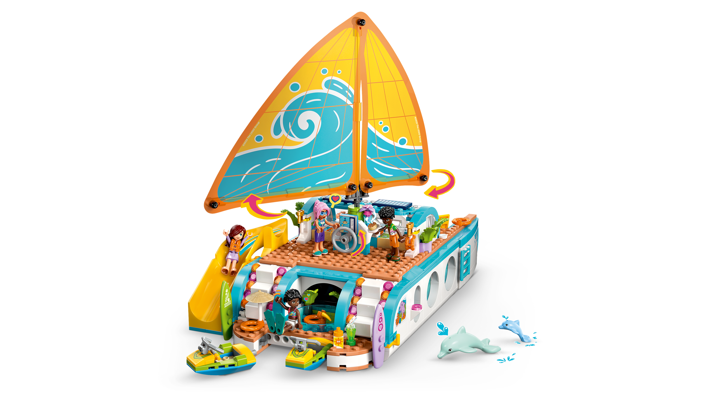 Spielset mit Boot und vielen Funktionen: Kinder können das Boot bauen und mit dem Modell dann eigene Geschichten darstellen. Die Freunde können auf dem Boot spielen, ausruhen und nach Delfinen Ausschau halten