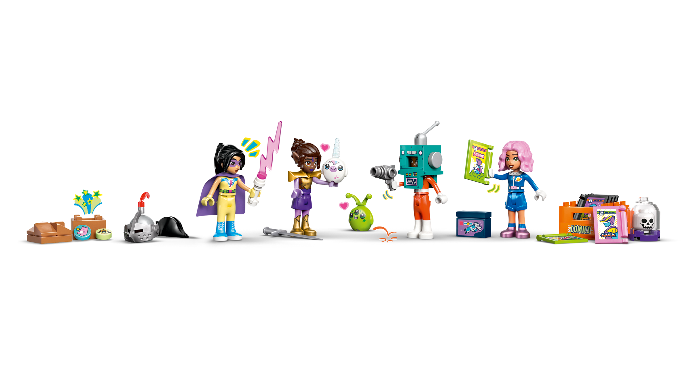Bauset für junge Helden: Der Comic- und Spieleladen ist ein Set für Mädchen und Jungen ab 9 Jahren. Das Set beinhaltet 4 Spielfiguren, 2 LEGO® „Plüschfiguren“ – Alien und Einhorn – und Zubehör