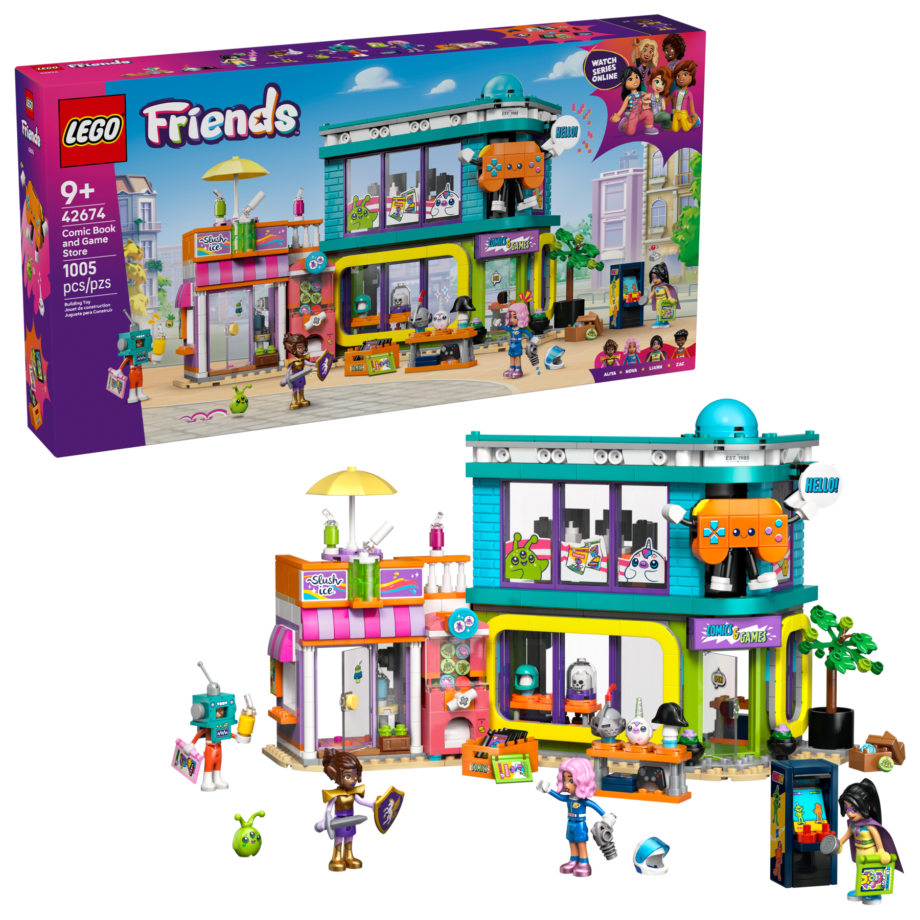 Kinder können lustige Abenteuer mit den Freunden Zac, Nova, Liann und Aliya darstellen, die sich als Roboter, Superheld, Galaxienentdecker und Ritter verkleidet haben. Im Laden können Kinder Plüschfiguren und einen Spielzeugautomaten entdecken, der niedliche kleine LEGO Steinchen ausspuckt. Und im Obergeschoss kann man Videospiele spielen, bevor man sich nebenan im Slush-Eis-Laden etwas Leckeres holt.