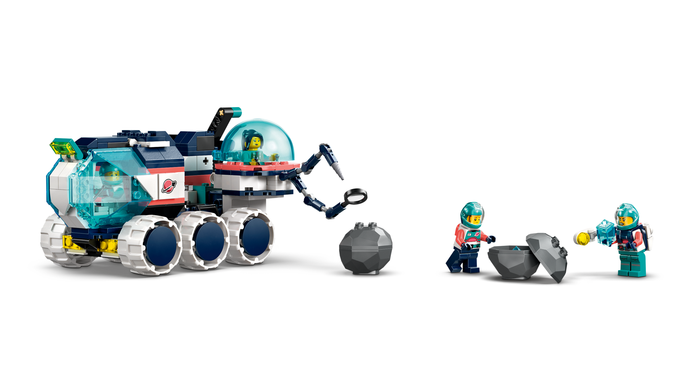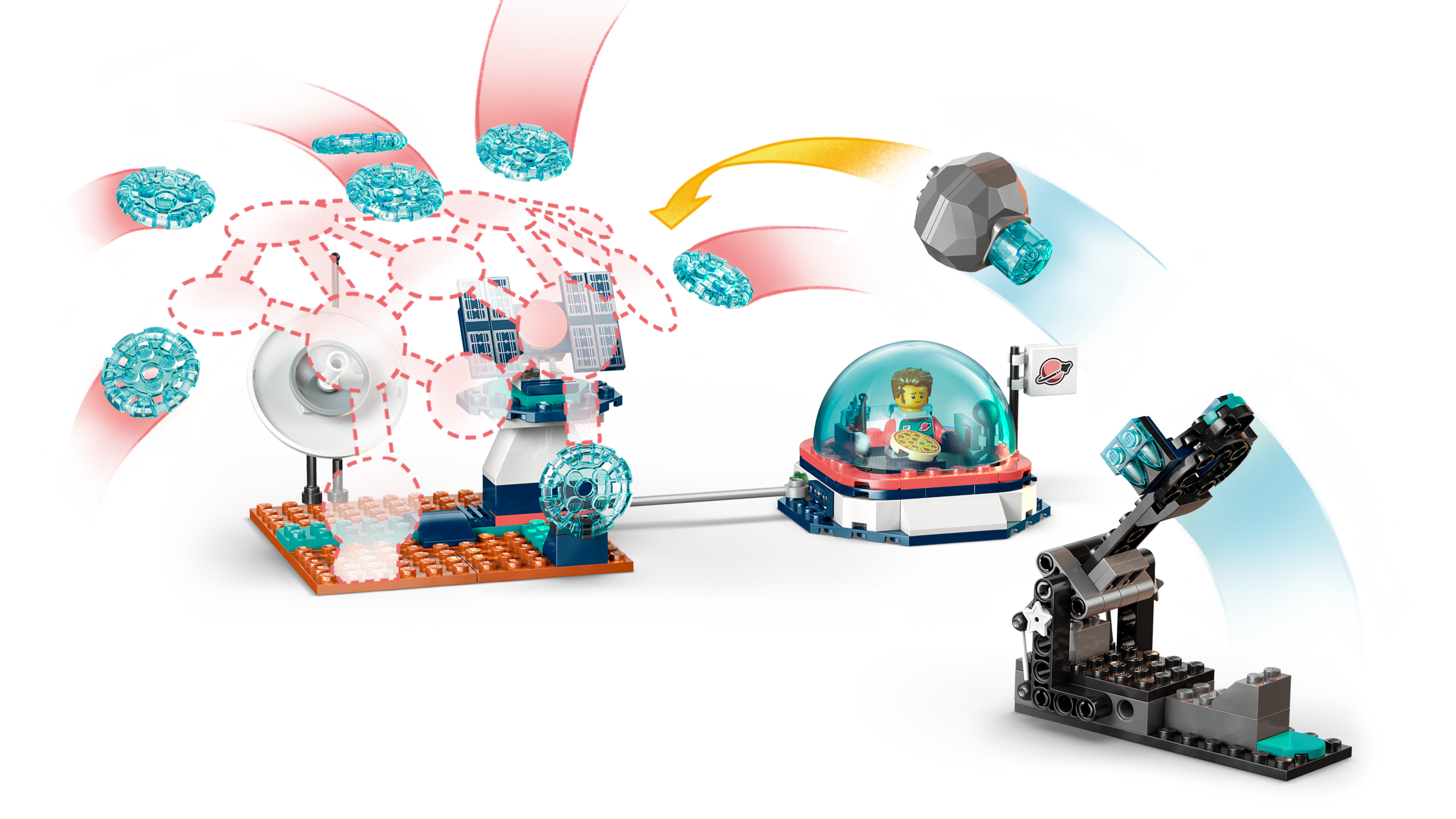 MINIFIGUREN UND ZUBEHÖR: Jede Astronaut-Minifigur trägt einen Helm und hat 2 Gesichter. Auch ein Becher, ein Kommunikationsgerät, Pizza und ein Materialscanner laden zum Spielen ein