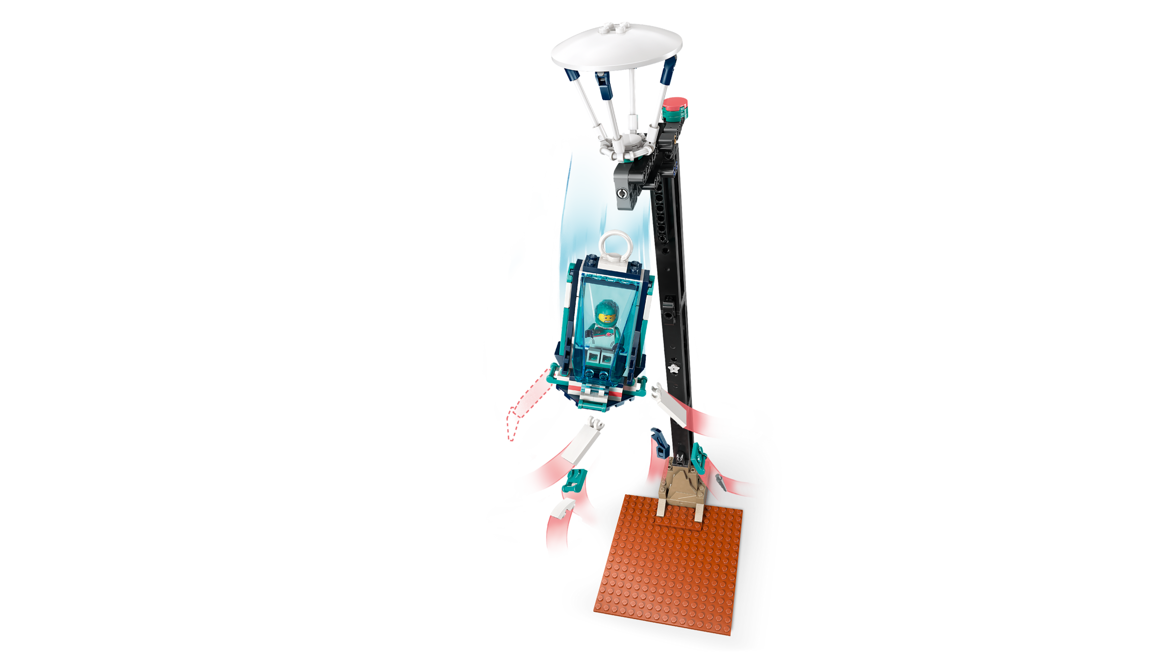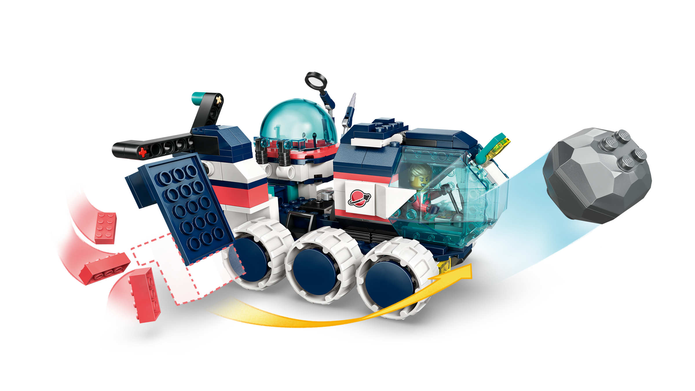 PHYSIKEXPERIMENTE UND FUNKTIONEN: Der Fliehkraftsimulator kreist, per Knopfdruck fällt die Freifallkapsel, ein Katapult schleudert Meteore, das Cockpit des LEGO® Marsrovers öffnet sich und ein „Kicker“ bewegt Gestein