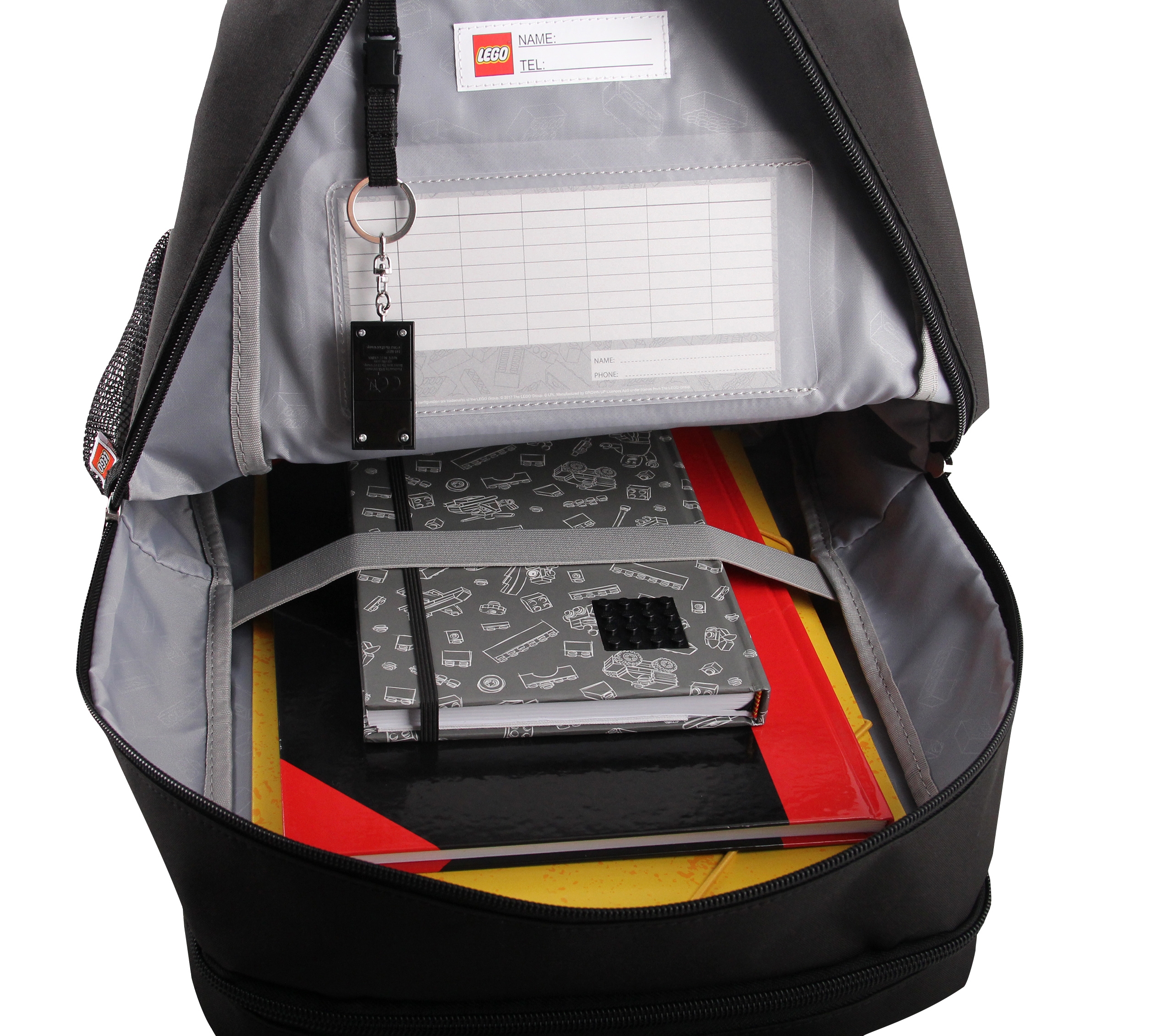 Das Hauptfach mit Reißverschluss verfügt über einen elastischen Riemen für Bücher, ein Stundenplanfach mit einem gedruckten Stundenplan, einen herausnehmbaren Schlüsselanhänger sowie ein Schild für Name/Telefonnummer zum einfachen Erkennen und Individualisieren.