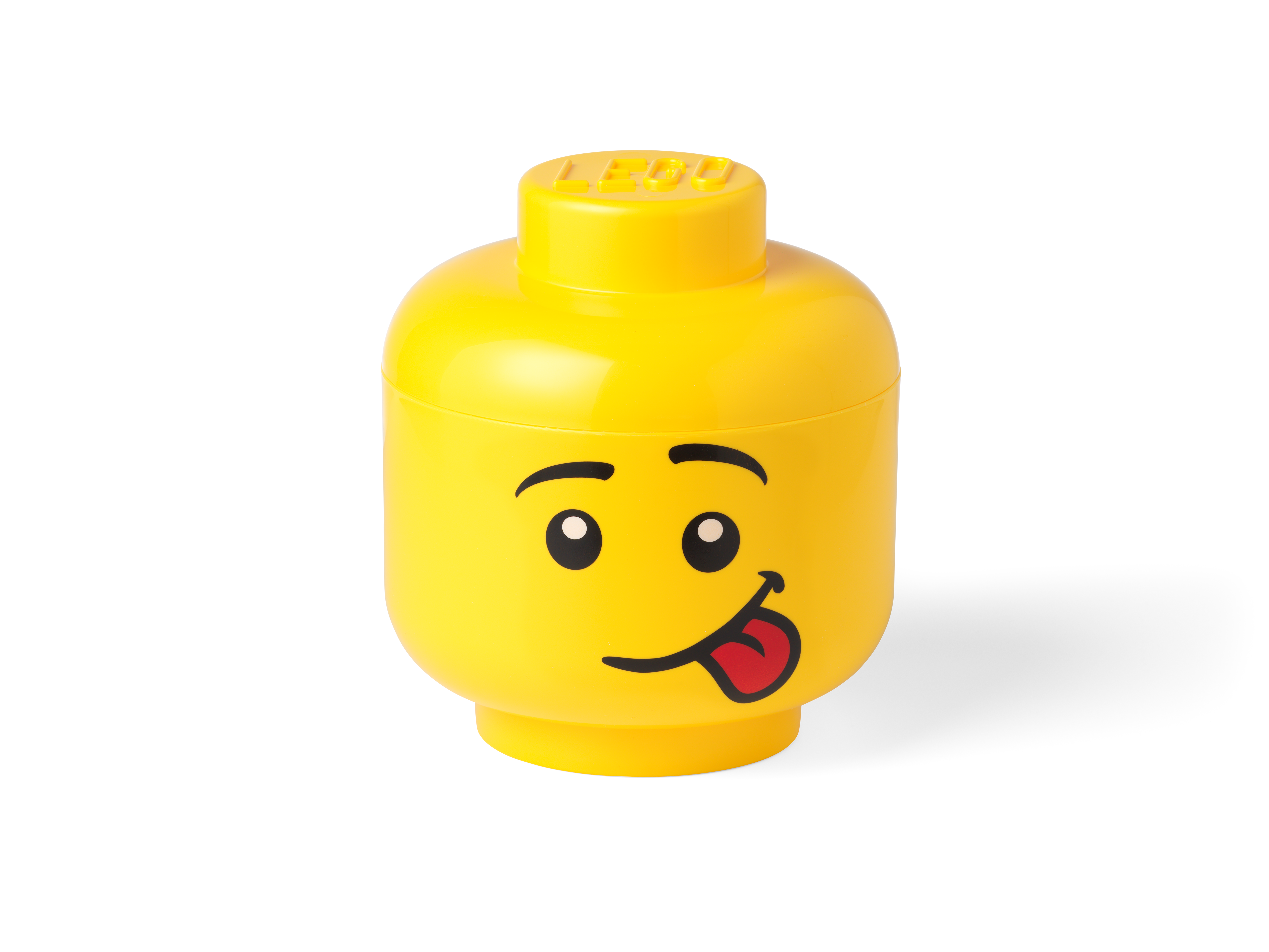 Witzige Aufbewahrungsbox: Großer LEGO® Minifigur-Kopf mit abnehmbarem Deckel und frechem Gesicht mit ausgestreckter Zunge.