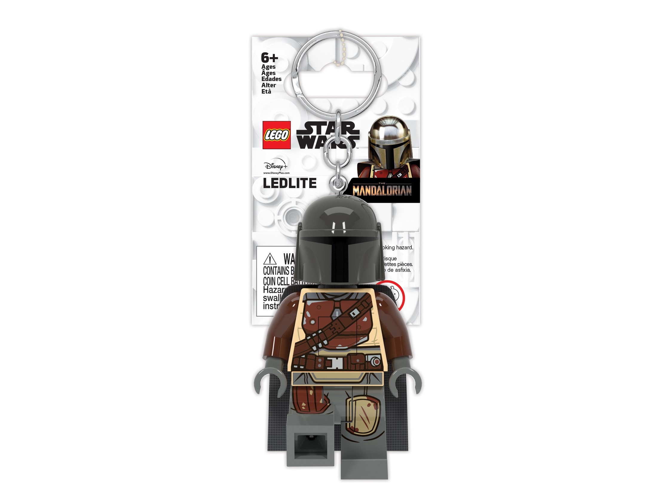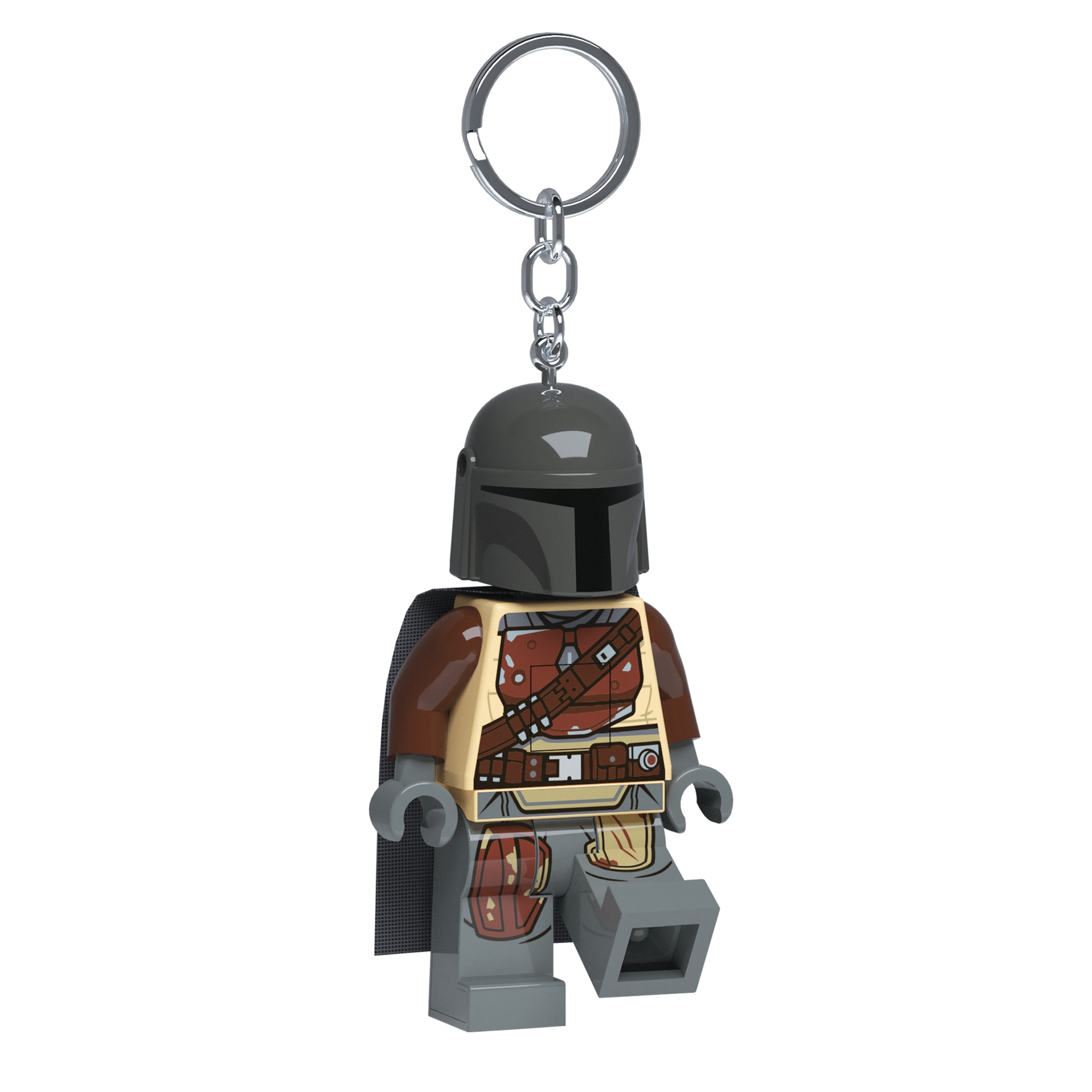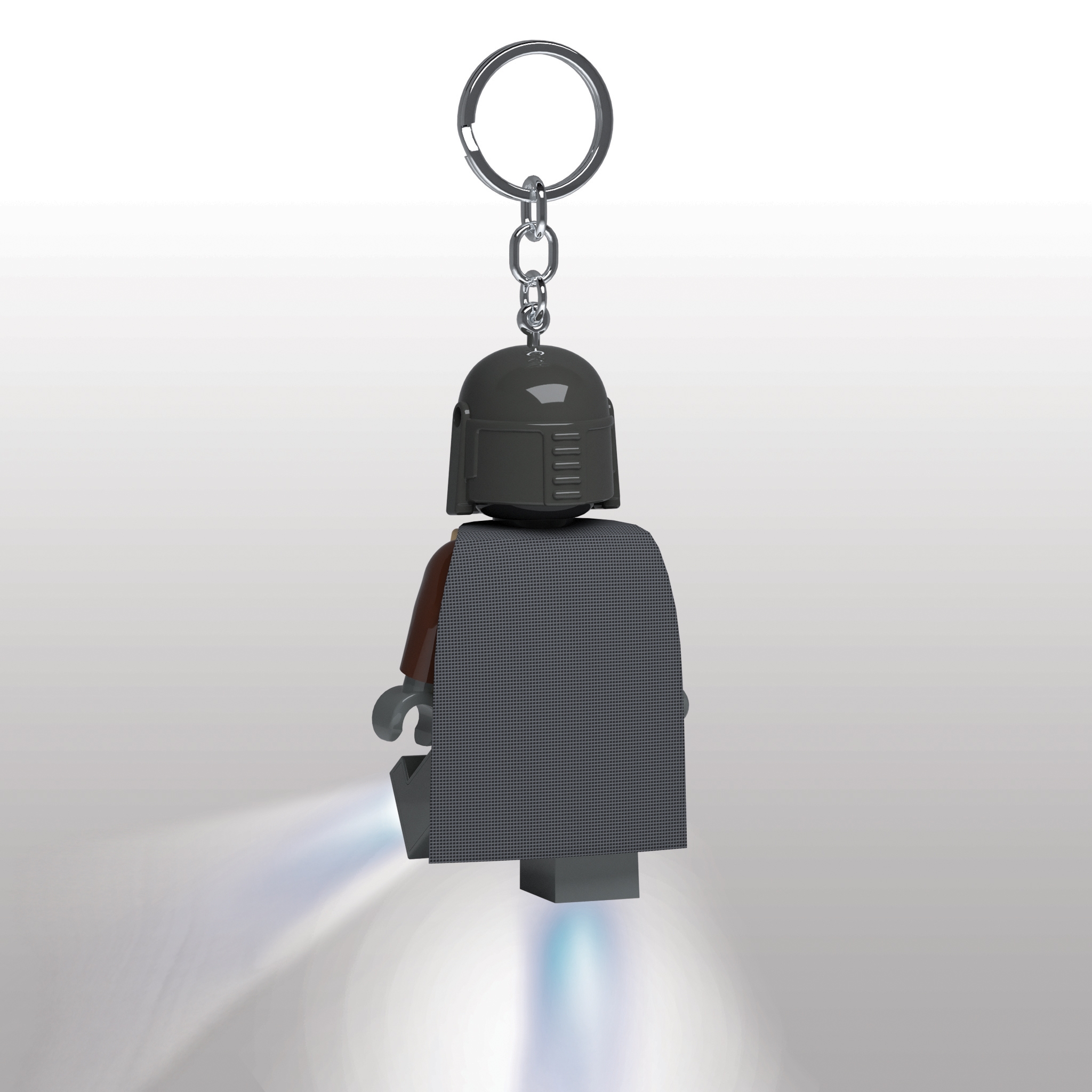 • In den Füßen der beweglichen großen Minifigur befinden sich 2 helle LED-Leuchten (zwei CR2025 Batterien sind enthalten). Der Mandalorianer ist an einer robusten Kette mit Schlüsselring befestigt