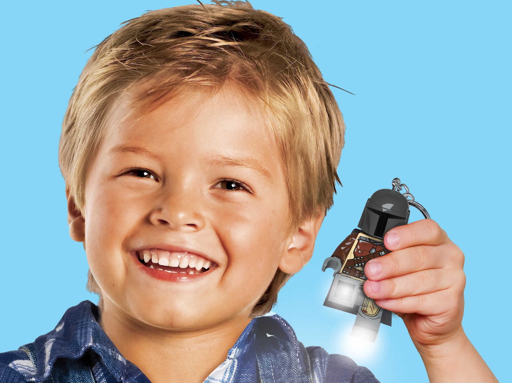 Star Wars™ Fans können mit dieser coolen Mandalorianer-Schlüsselleuchte ihren Weg ausleuchten. In den Füßen der beweglichen LEGO® Minifigur befinden sich helle LED-Leuchten. Durch Drücken des Oberkörpers wird das Licht eingeschaltet. Der legendäre Kopfgeldjäger hängt an einem robusten Schlüsselring und macht sich gut an jedem Schlüsselbund oder Rucksack.