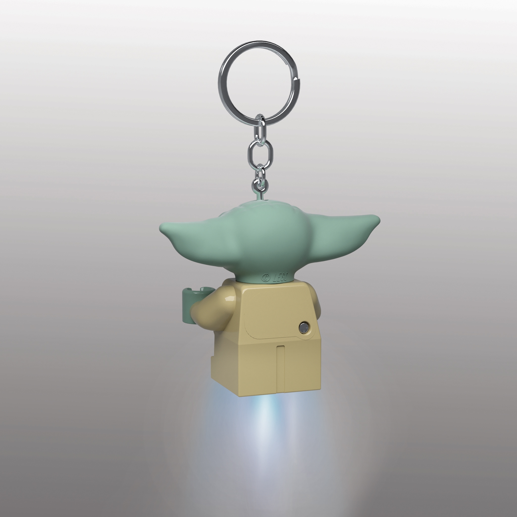 Grogu-Schlüsselleuchte: Große Version der LEGO® Grogu-Figur mit beweglichen Armen, einer hellen LED-Leuchte im Sockel, Ein/Aus-Schalter auf der Brust und Metallring zur Befestigung an Taschen, Rucksäcken oder Schlüsseln