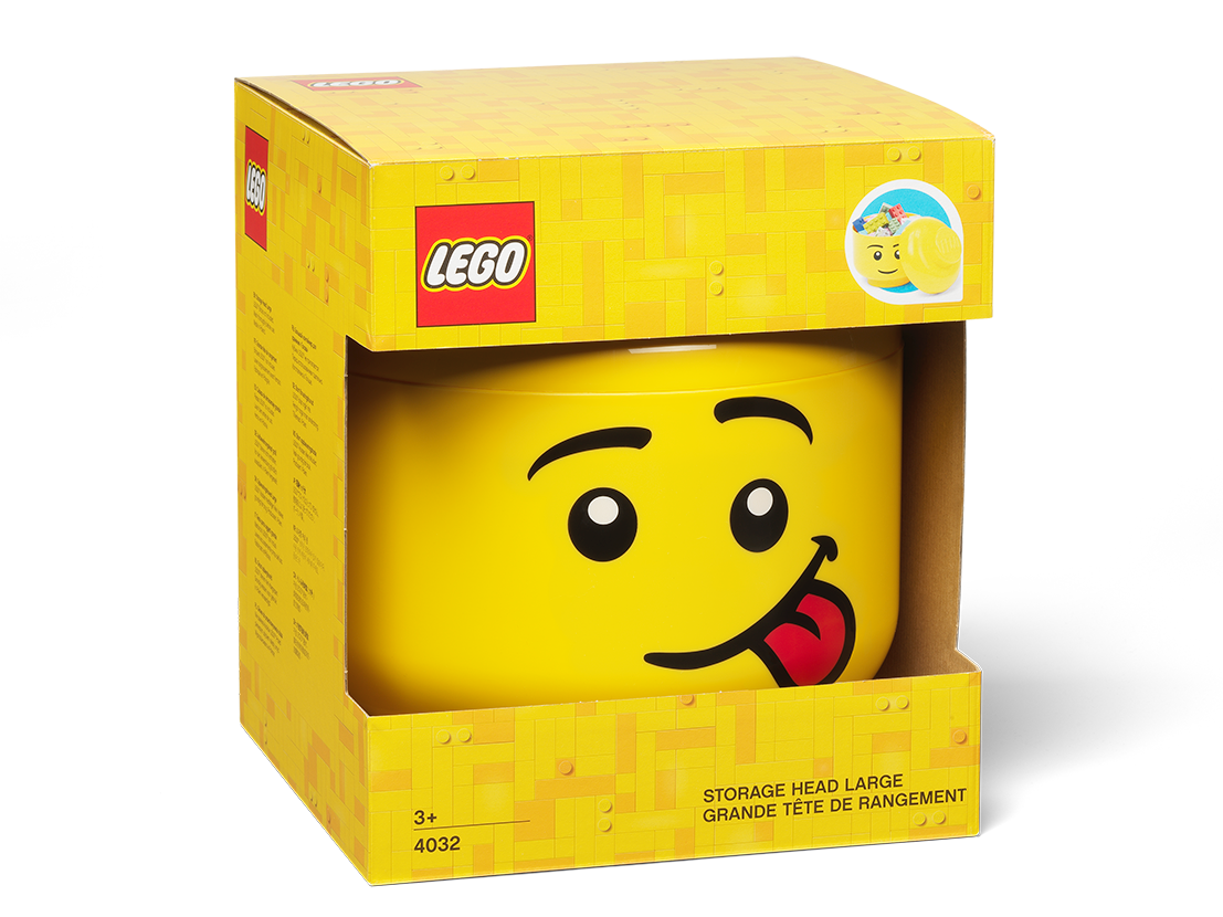 Witziger Behälter: Großer LEGO® Minifigur-Kopf mit abnehmbarem Deckel und frechem Gesicht mit ausgestreckter Zunge.
