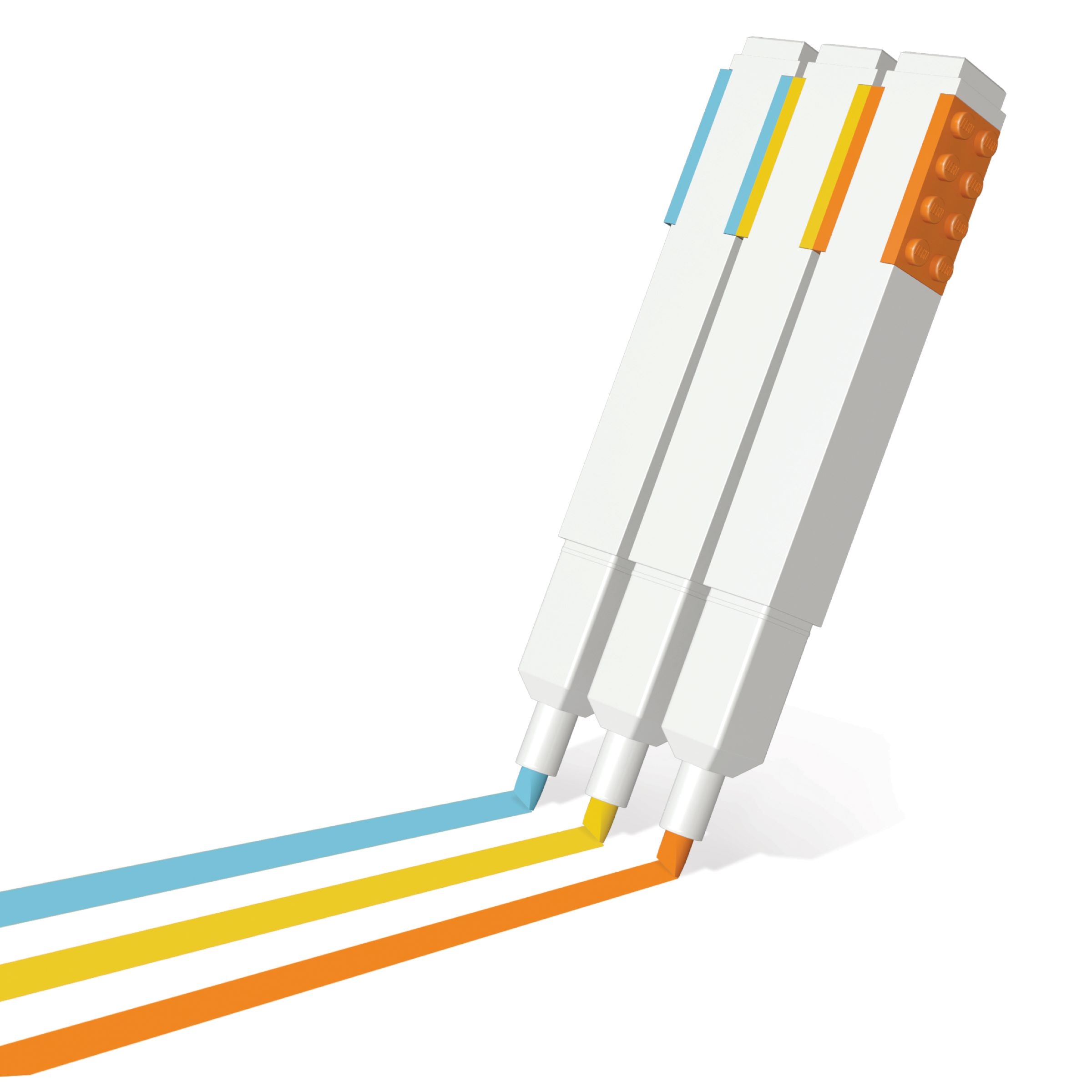 LEGO® Fans werden mit diesen Textmarkern in 3 fantastischen Leuchtfarben – Gelb, Orange und Blau – gern jede Textstelle hervorheben. Die flachen Seiten verhindern, dass die Stifte vom Tisch rollen. Und die meißelförmige Spitze eignet sich sowohl für breite als auch für schmale Markierungen. Oben ist jeder Stift mit einer LEGO 2x4 Platte versehen, auf die Kinder eine LEGO Minifigur oder ein kleines LEGO Modell aufstecken können. Diese Stifte bringen Farbe ins Leben jedes LEGO Fans.