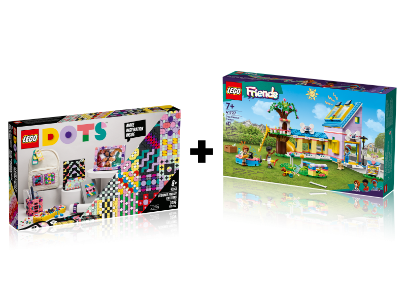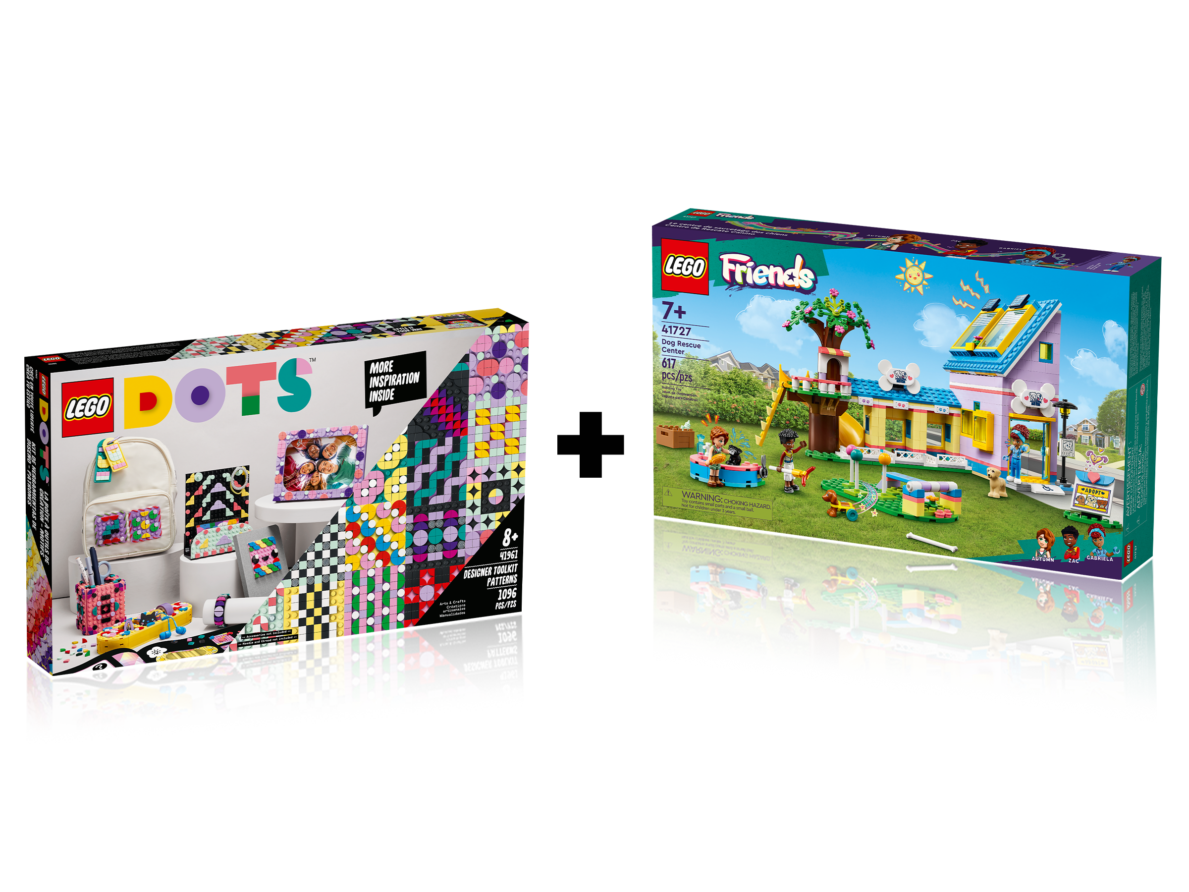 Tierliebe oder designbegeisterte Kinder können mit diesem faszinierenden Paket besonders kreativ werden, denn es besteht aus dem LEGO® DOTS Designer-Set Muster und dem LEGO Friends Hunderettungszentrum. Schau dir an, wie dein Kind seiner Fantasie freien Lauf lässt, wenn es das breite Spektrum an bunten Steinchen benutzt, um die verschiedenen DOTS Dekorplatten zu verzieren. Anschließend kann sich dein Kind auch noch mit dem Hunderettungszentrum vergnügen. Das Set beinhaltet jede Menge Tierpflegeutensilien. Und da das Modell aus Modulen aufgebaut ist, kann man den Grundriss des Gebäudes nach Herzenslust umgestalten.
