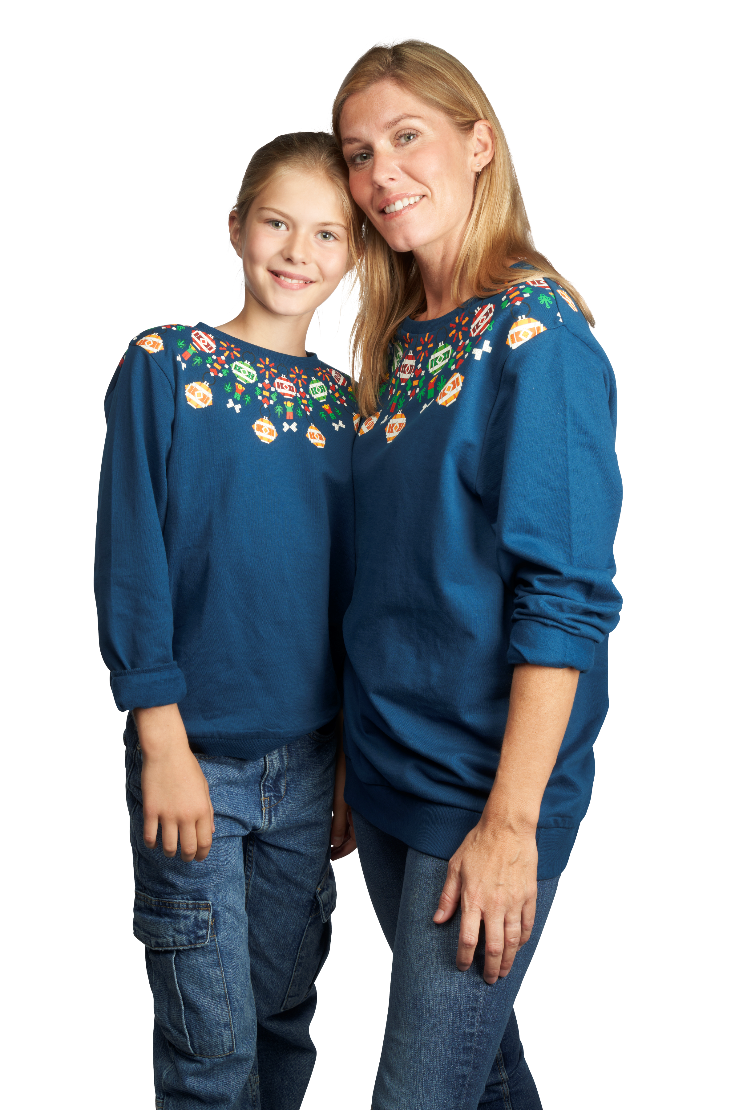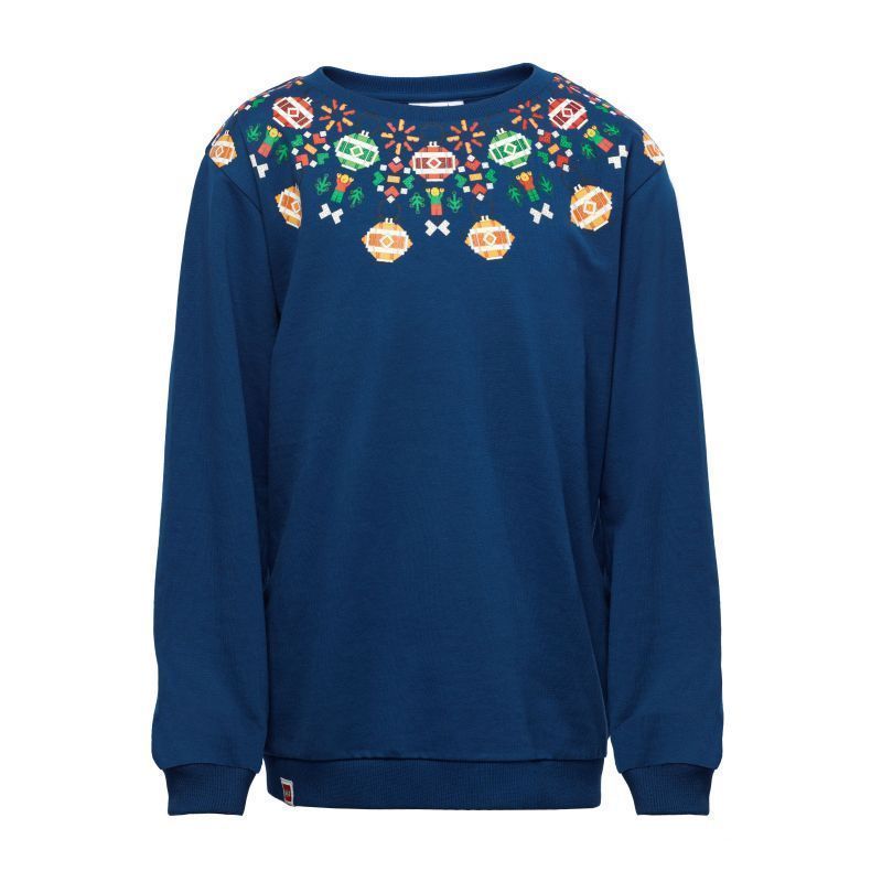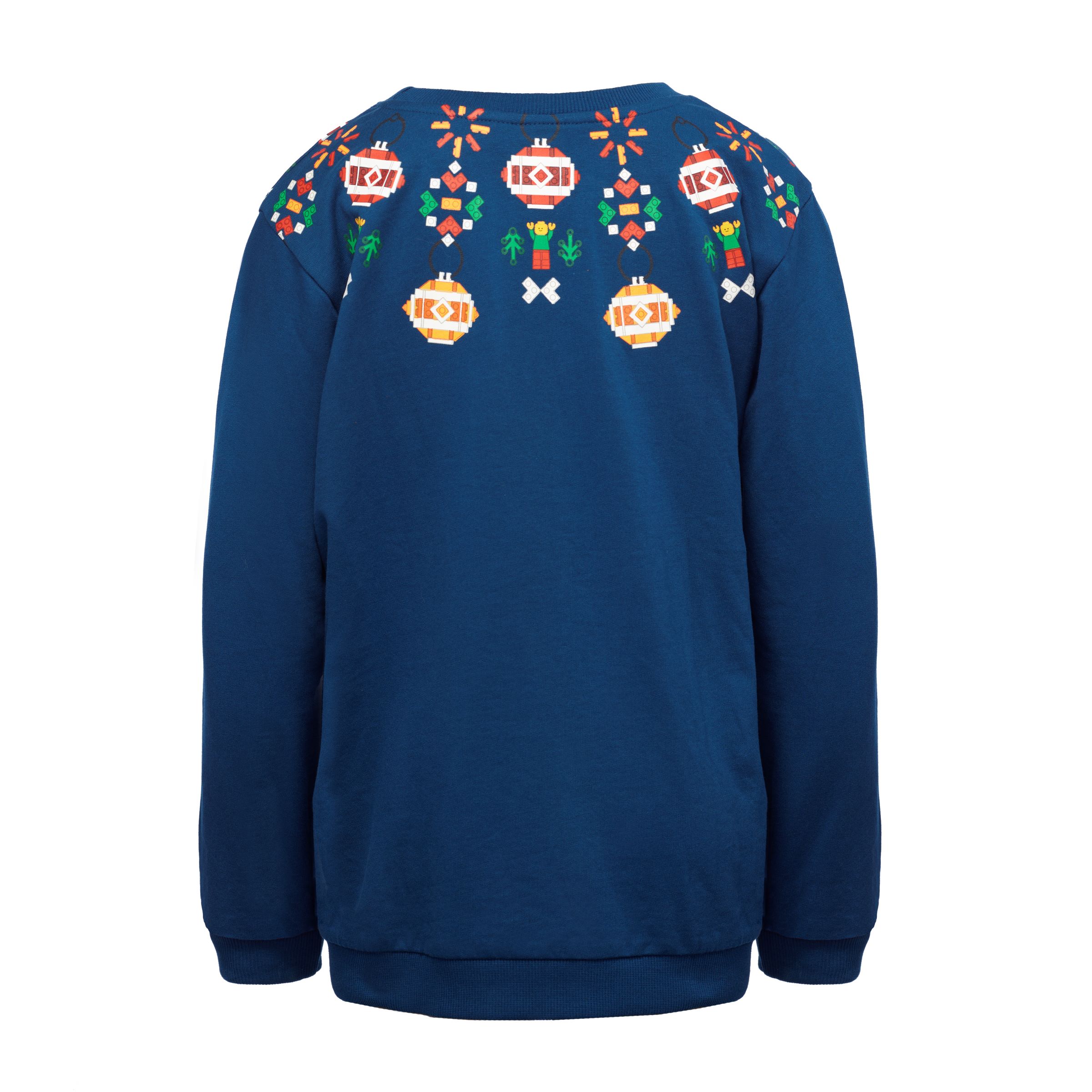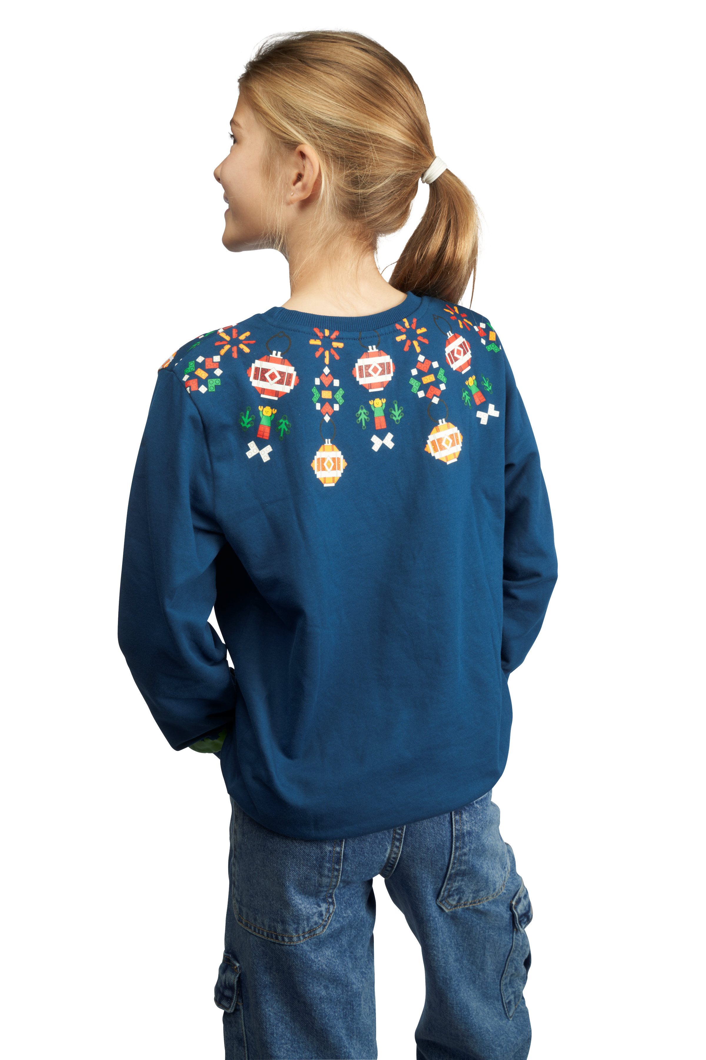 LEGO® Sweatshirt für Kinder: Die Schulterpartie des blauen Sweatshirts ist vorne und hinten mit Weihnachtskränzen und Weihnachtsschmuck aus LEGO Steinen verziert