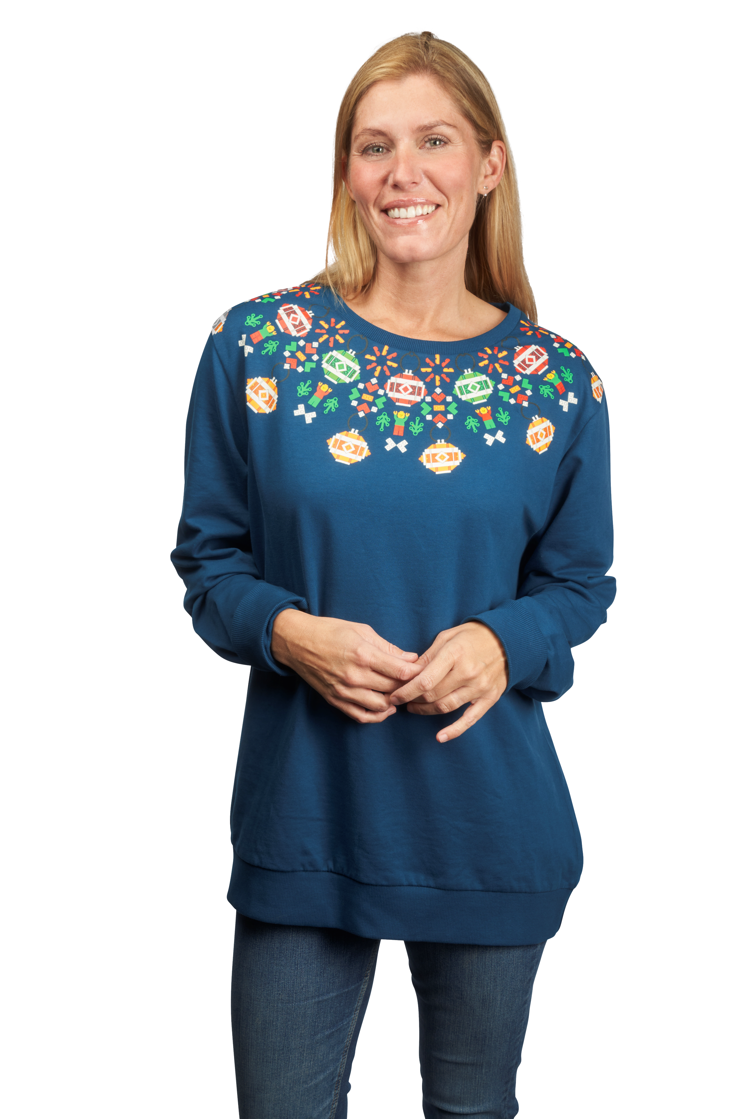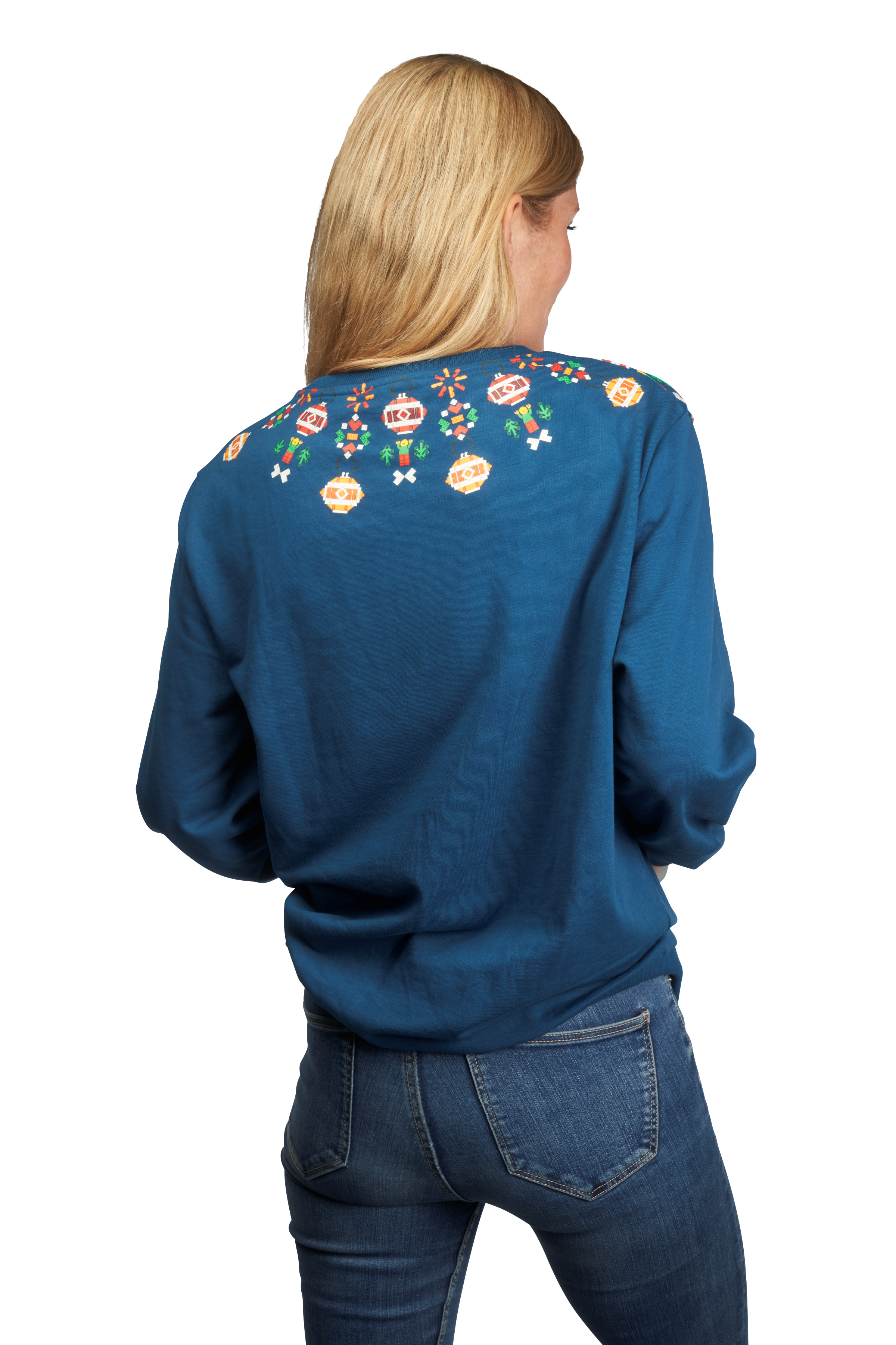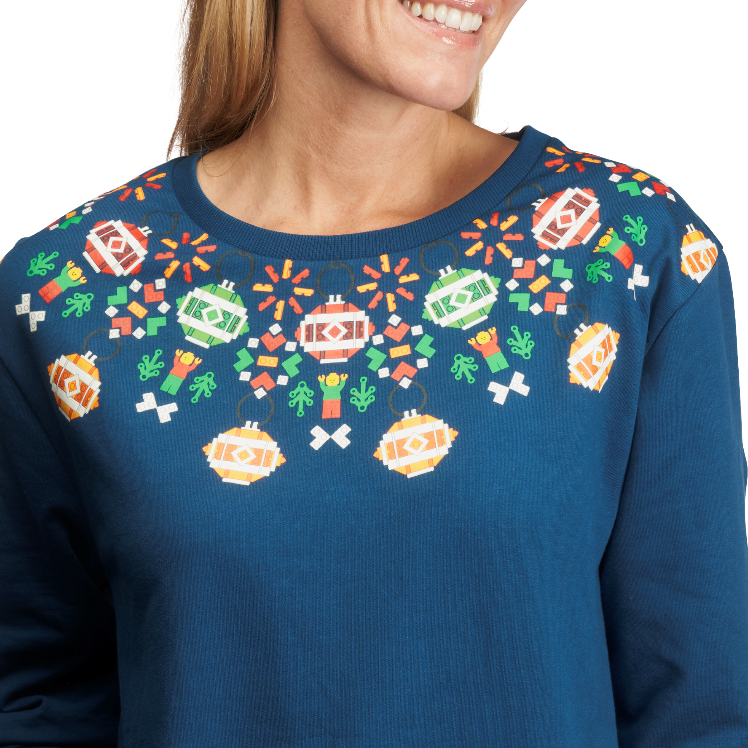 LEGO® Sweatshirt für Erwachsene: Die Schulterpartie des blauen Sweatshirts ist vorne und hinten mit Weihnachtskränzen und Weihnachtsschmuck aus LEGO Steinen verziert