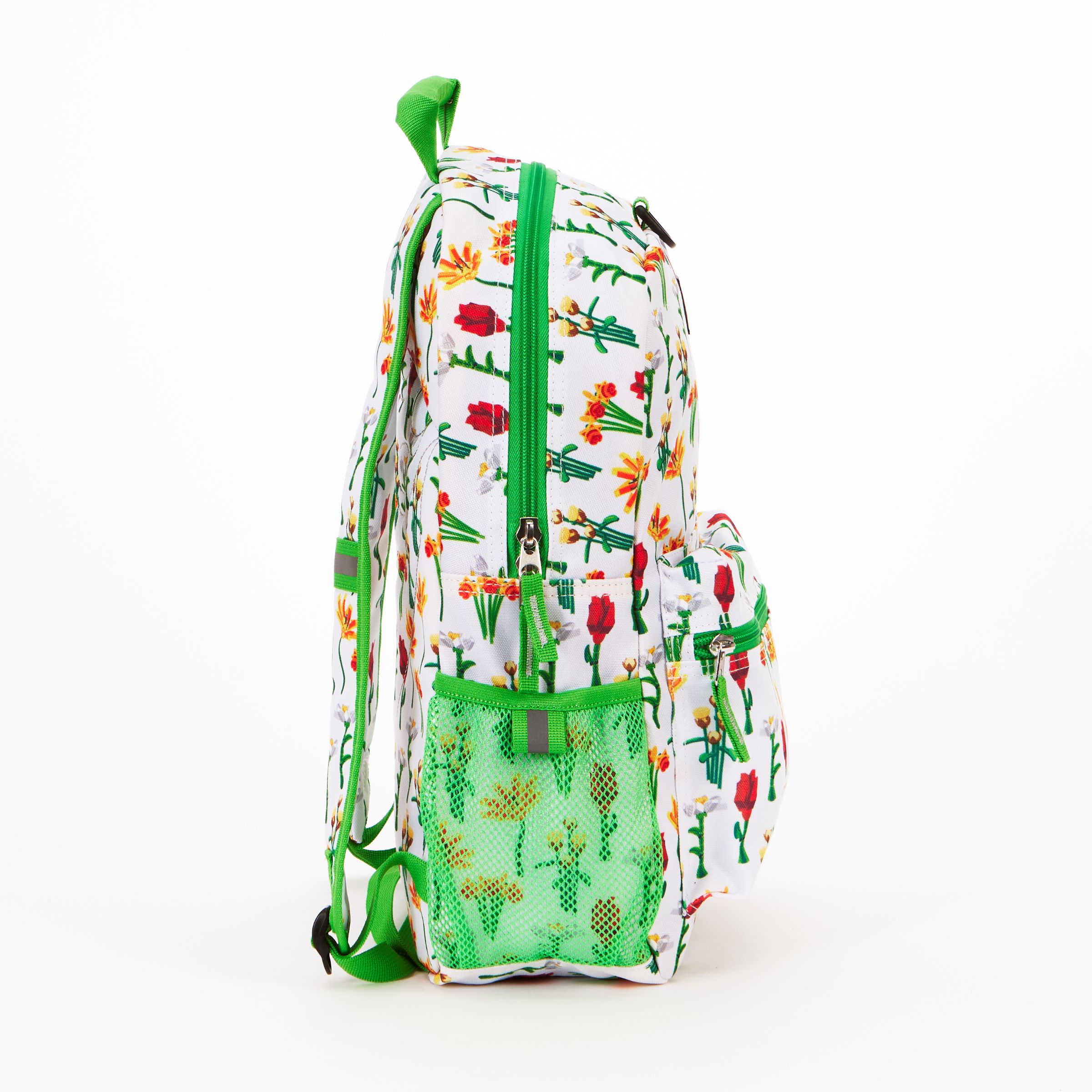 LEGO® Tasche für naturbegeisterte Kinder: Dieser LEGO Rucksack ist mit Blumen bedruckt und verfügt über ein Hauptfach mit Reißverschluss und Schlupftasche, eine Fronttasche mit Reißverschluss und eine Netzseitentasche