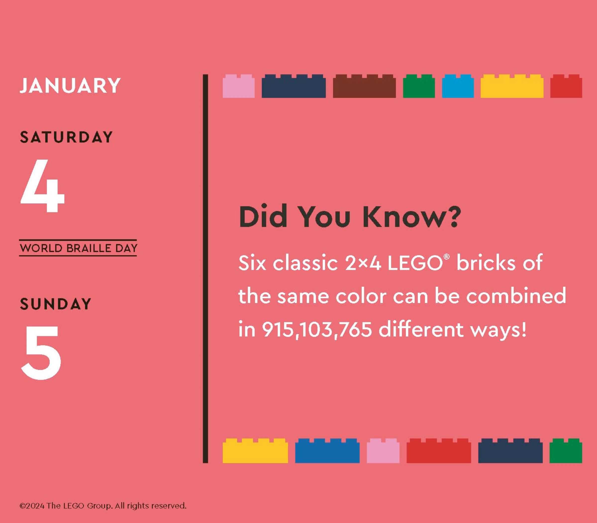 Farbenfroher LEGO® Kalender: Dieser lustige Kalender ist 13 cm hoch und 15 cm breit. Er lässt dich jeden Tag mit einem Lächeln beginnen