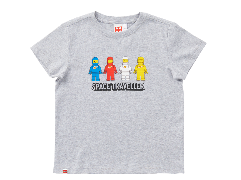 LEGO® Raumfahrer-T-Shirt für Kinder: Auf die Brust dieses tollen hellgrauen Kurzarm-T-Shirts sind 4 LEGO Raumfahrer-Minifiguren aufgedruckt