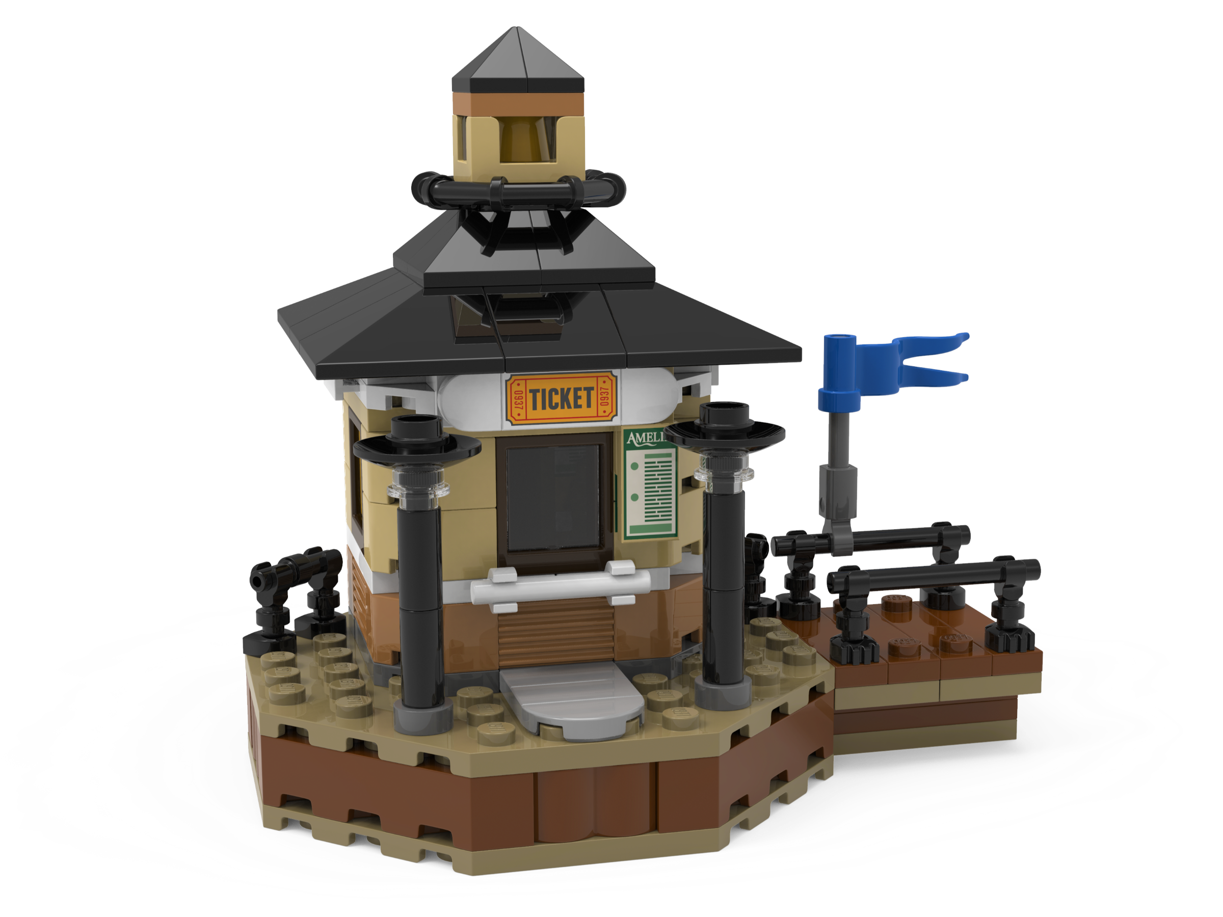 Bauspielzeug zum Sammeln: Das LEGO® Amelia-Tickethäuschen besteht aus einem Ticketschalter, einem Turm, einem Landungssteg, einer Flagge und Zierelementen. In dem Gebäude befinden sich ein Museum, ein Flussschiff und eine Mikrofigur