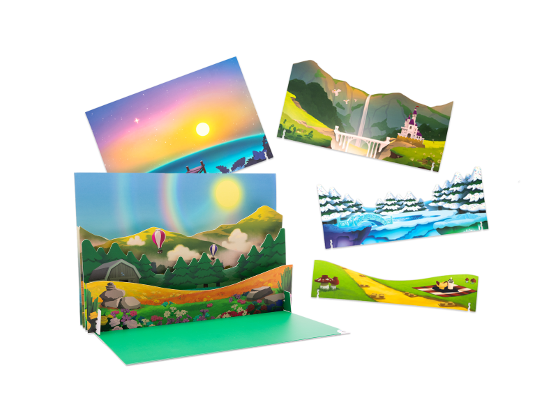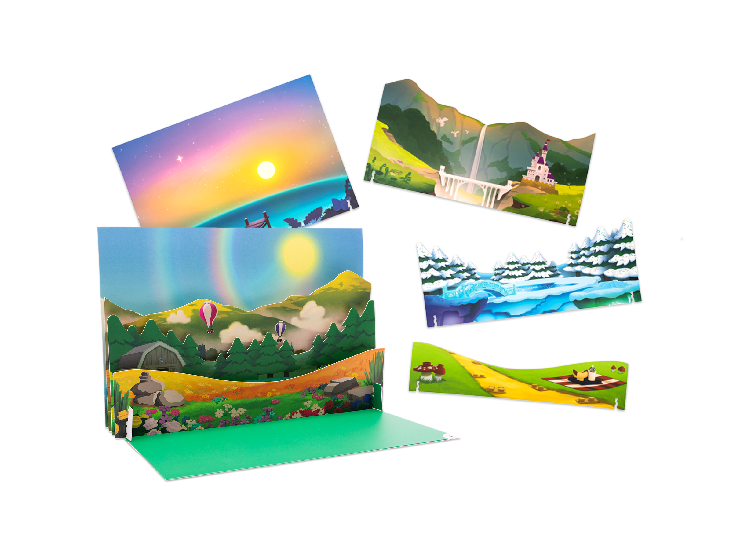 Erschaffe eine Landschaft: Klapp den äußeren Karton auf und steck die 4 Bilder, die den Himmel, Berge, Bäume und Gräser, Blumen und Felsen darstellen, in die Schlitze, um einen mehrlagigen Hintergrund zu erschaffen. Die Bilder sind auf festeKartonbögen gedruckt
