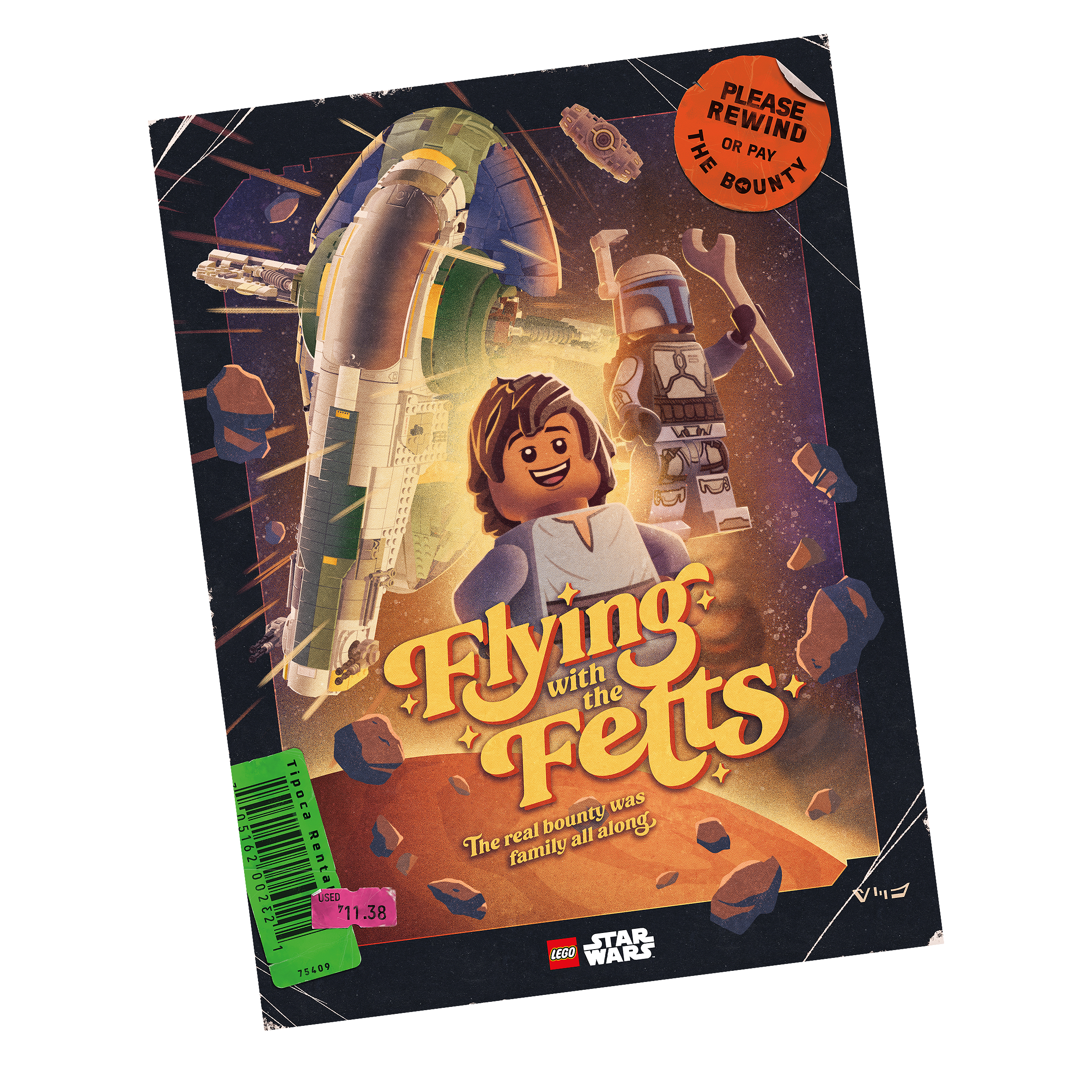 Poster in Retro-Aufmachung: Feiere 2 legendäre Kopfgeldjäger mit diesem LEGO® Star Wars™ Poster, das einer VHS-Videokassettenhülle aus den 1980ern nachempfunden ist und vom renommierten Star Wars Künstler Joe Hogan gestaltet wurde
