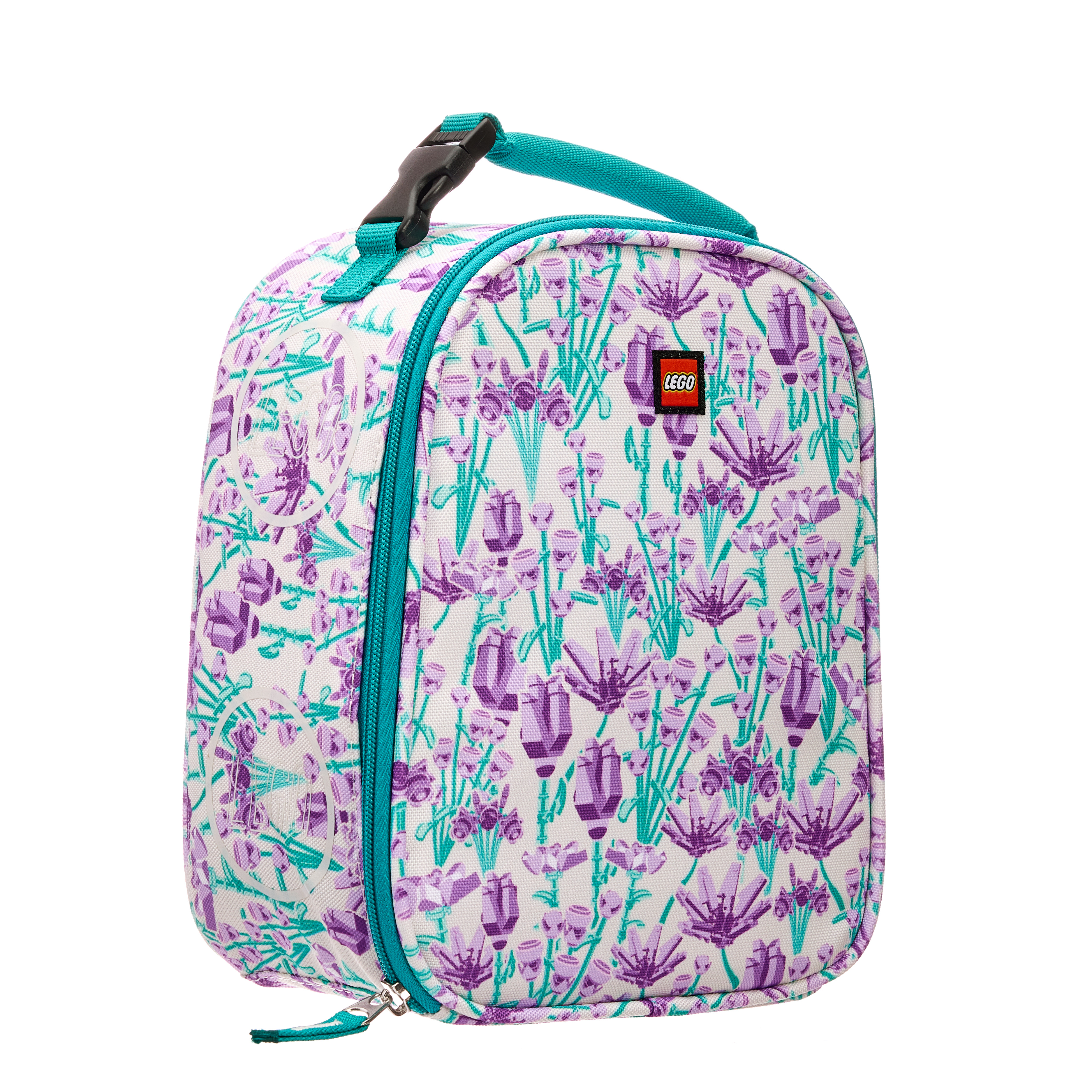 Geschenk mit Blumenmuster für Kinder ab 3 Jahren: Die LEGO® Lila Blumenstrauß Brotzeittasche hält Speisen frisch und Getränke kühl. Ein LEGO Blumenmuster ziert die Tasche mit Isolierfach und Reißverschluss