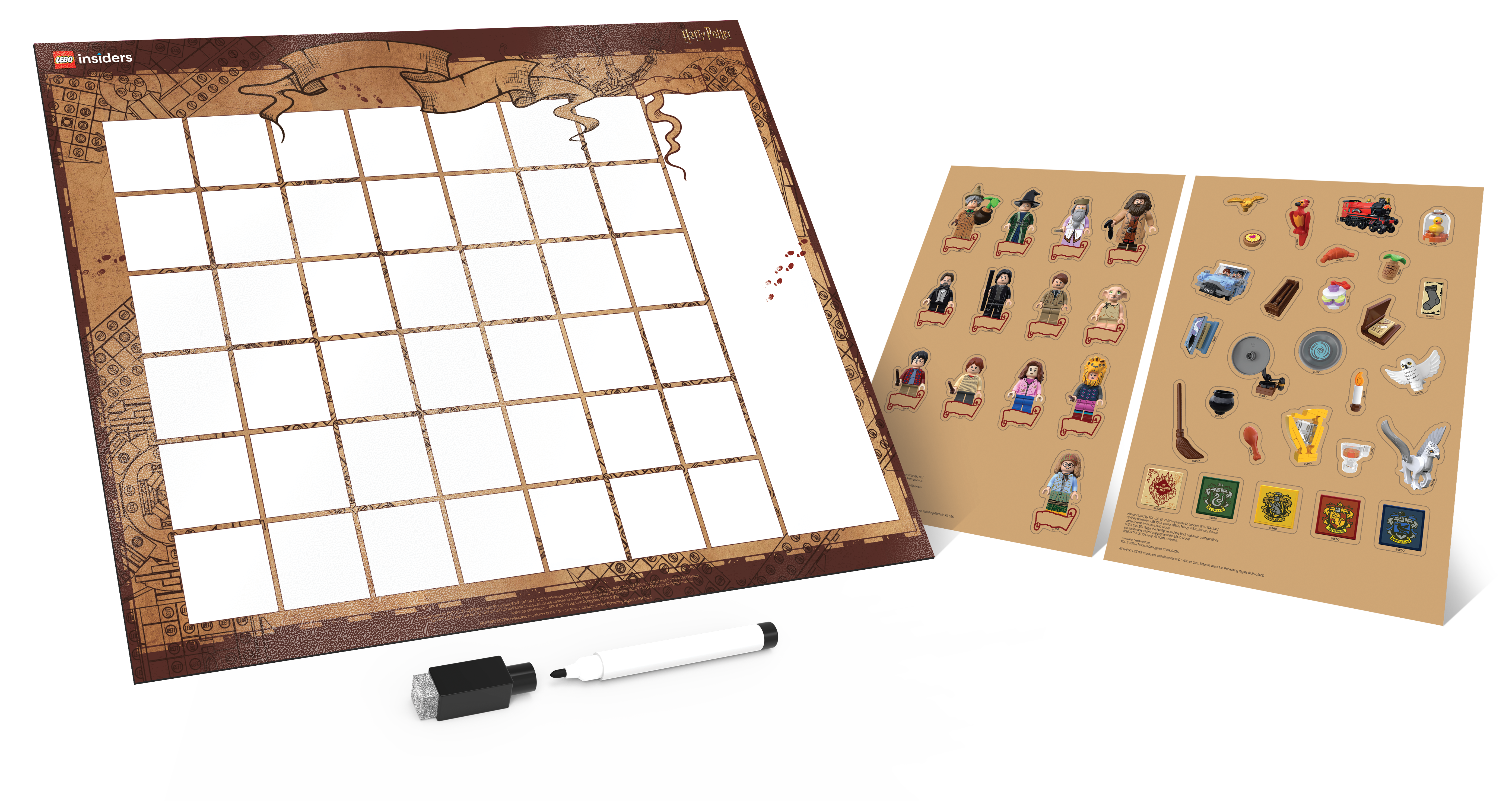 MAGNET-TERMINKALENDER: Der magnetische LEGO® Insiders Harry Potter™ Terminkalender mit Motiven der Karte des Rumtreibers, ein abwischbarer schwarzer Stift und 4 Bögen mit wiederverwendbaren Aufklebern lassen dich alle wichtigen Termine planen