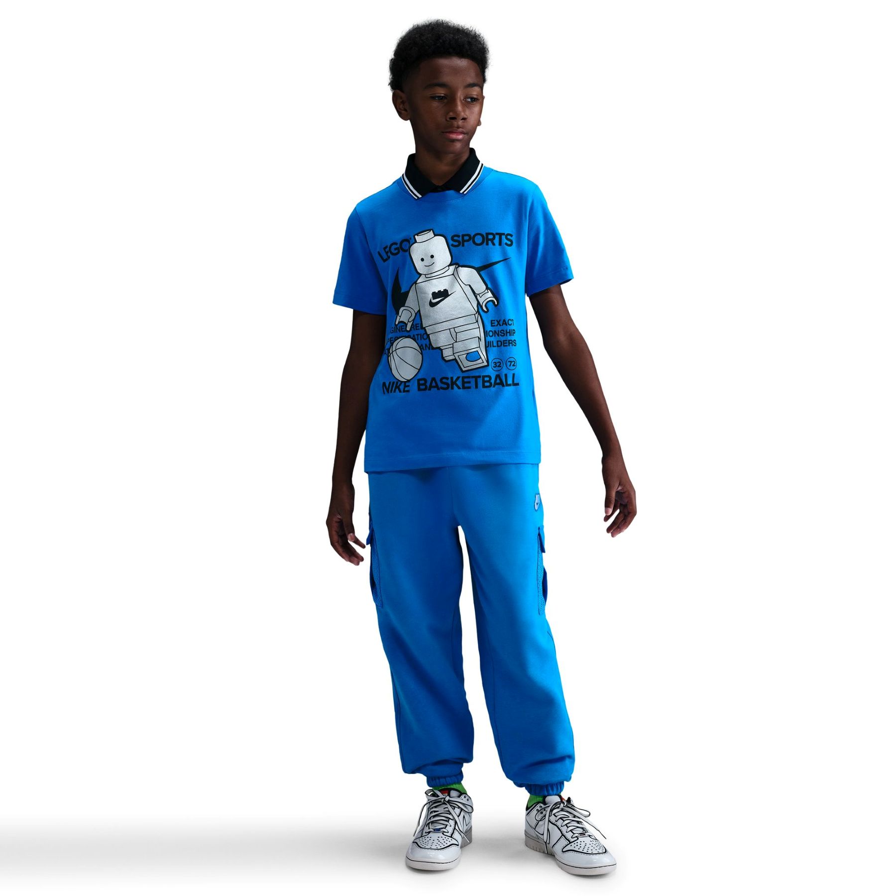 SPORTGRAFIK: Auf der Brust des T-Shirts in legendärem LEGO® Blau ist eine Nike x LEGO Minifigur abgebildet, die mit einem Basketball dribbelt