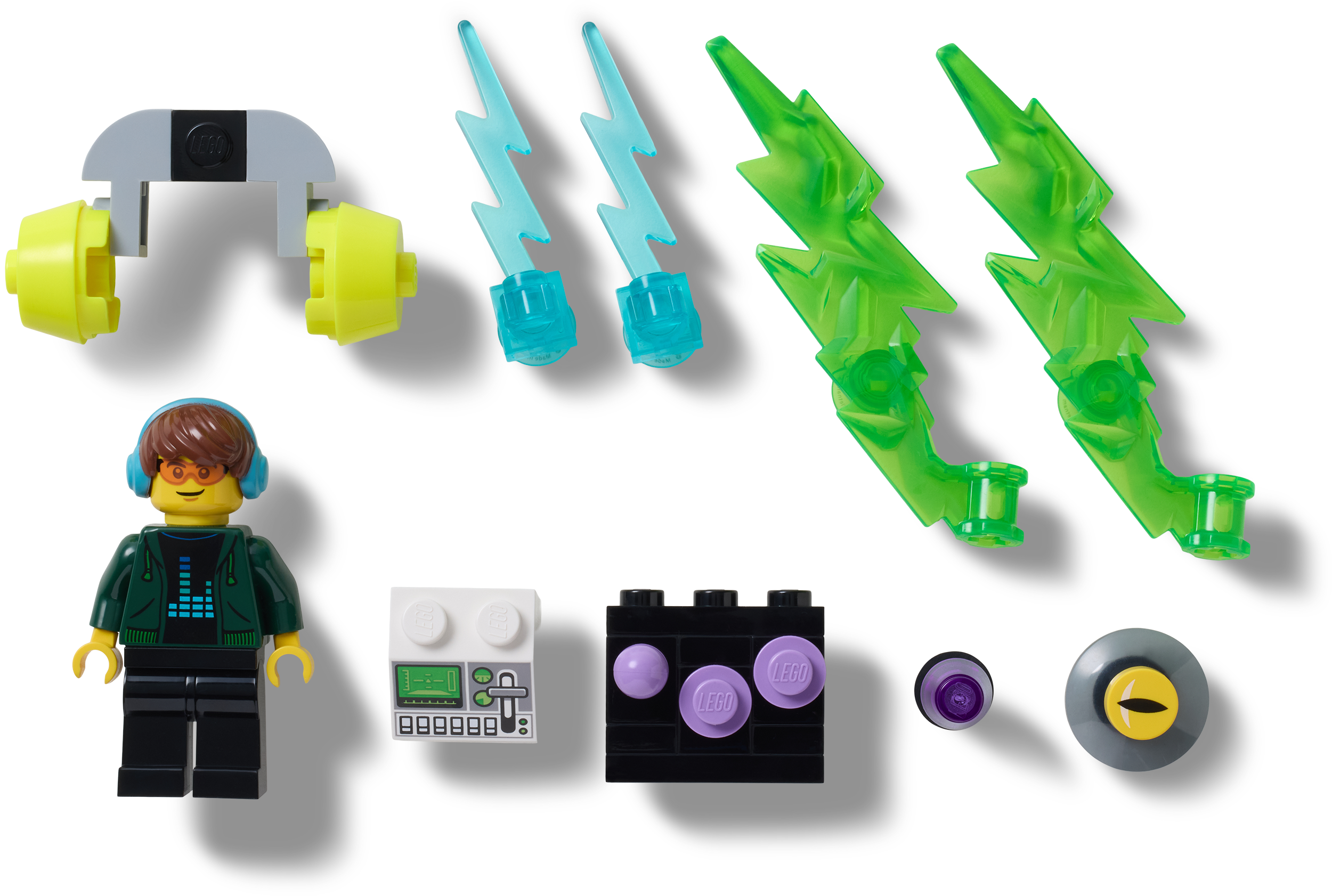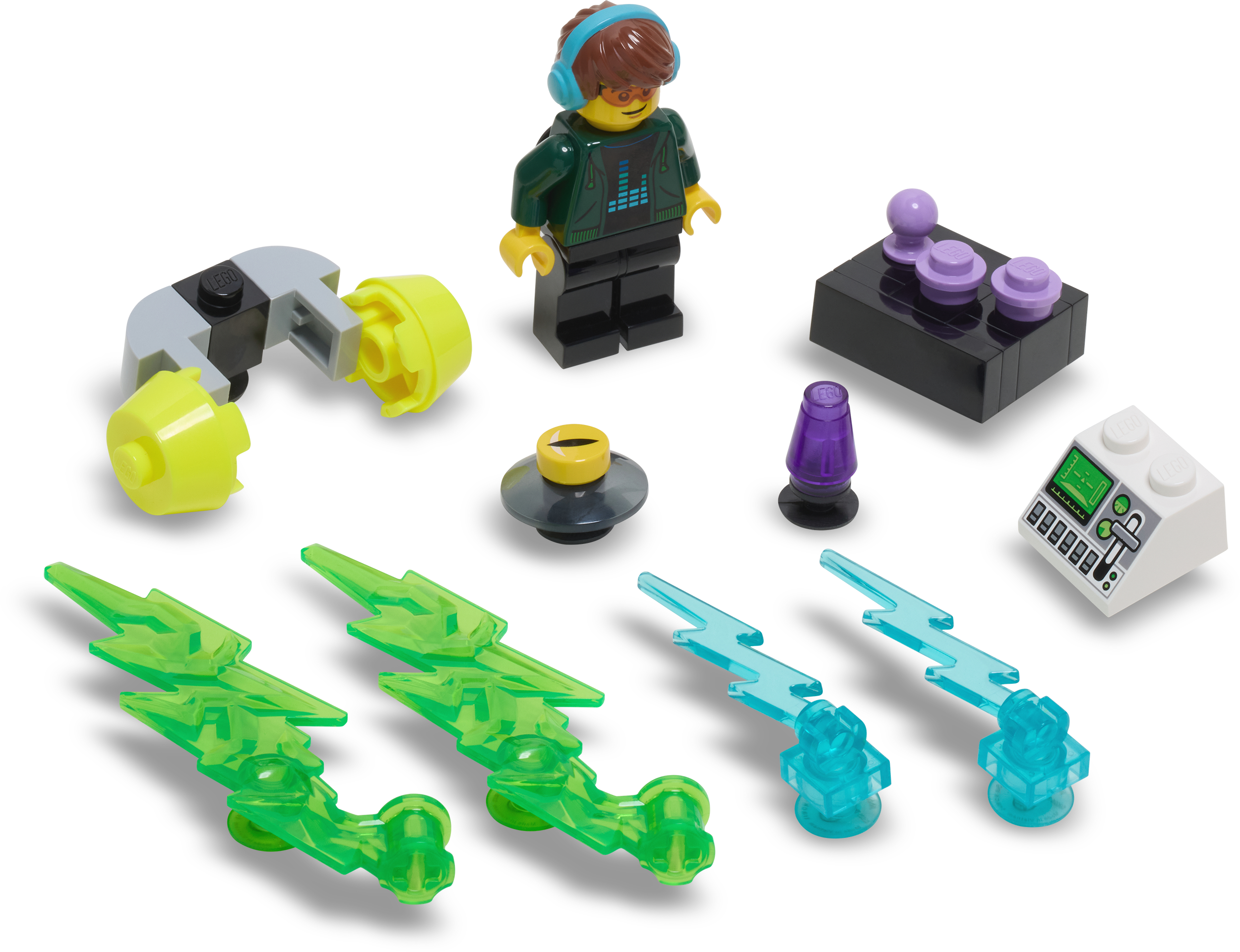 AUTHENTISCHE JIBBITZ™ CHARMS: Eine Gamer-Minifigur, ein Vormodell, ein Augapfel und Kopfhörer sind traditionellen LEGO® Teilen nachempfunden, aber ungefähr 50 % größer dargestellt