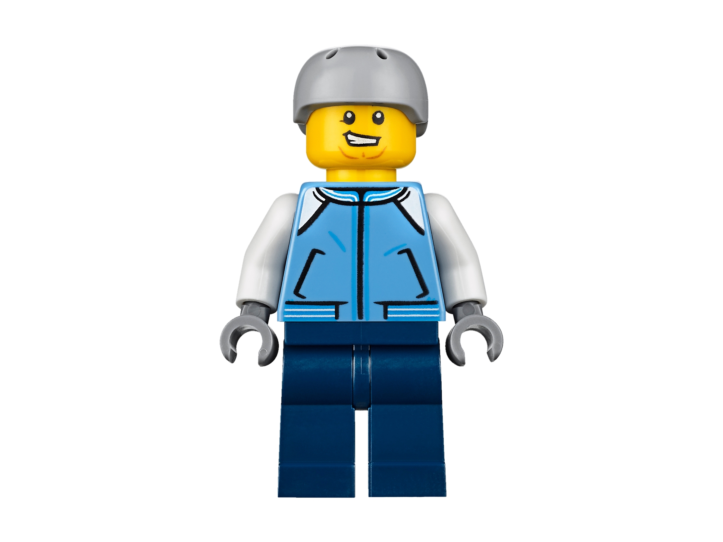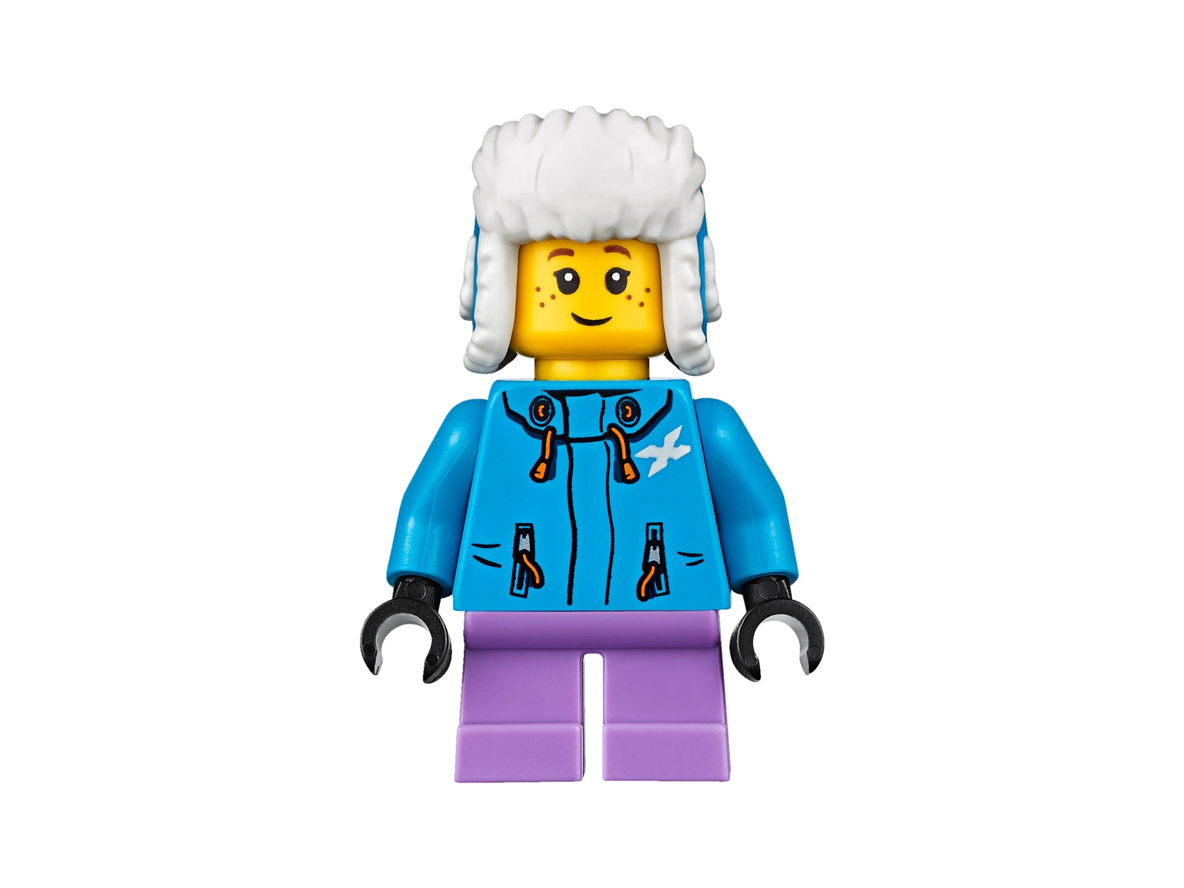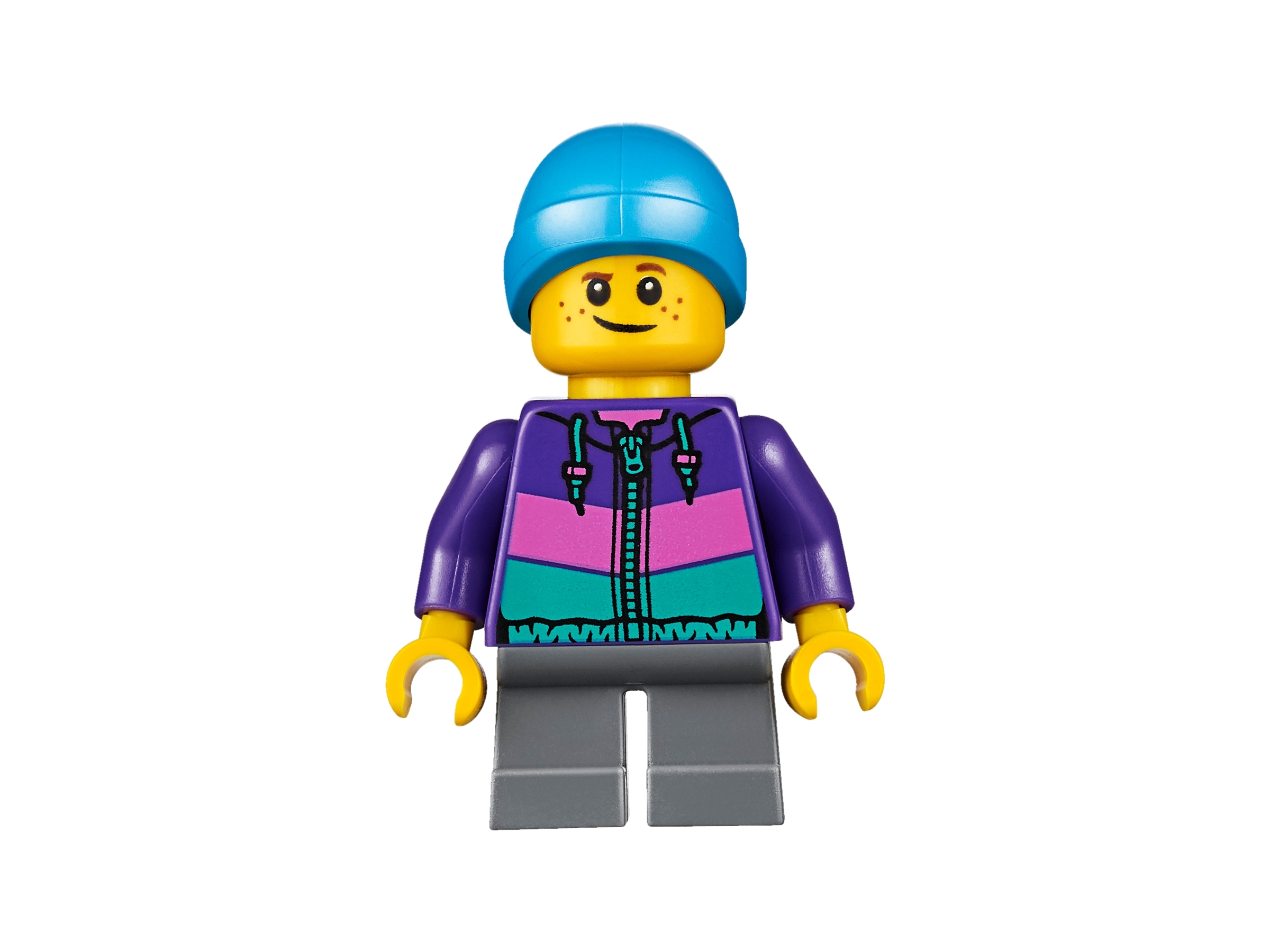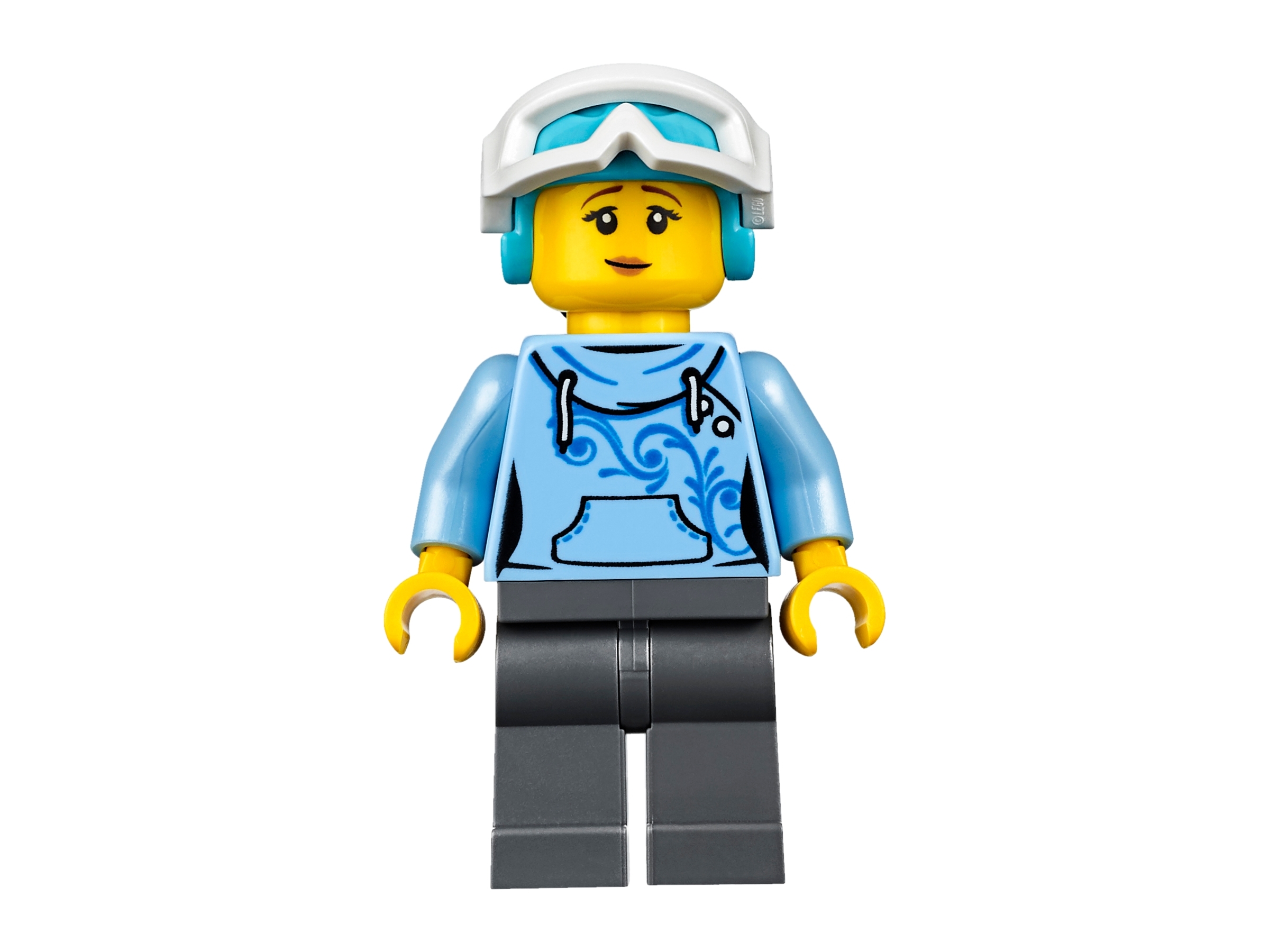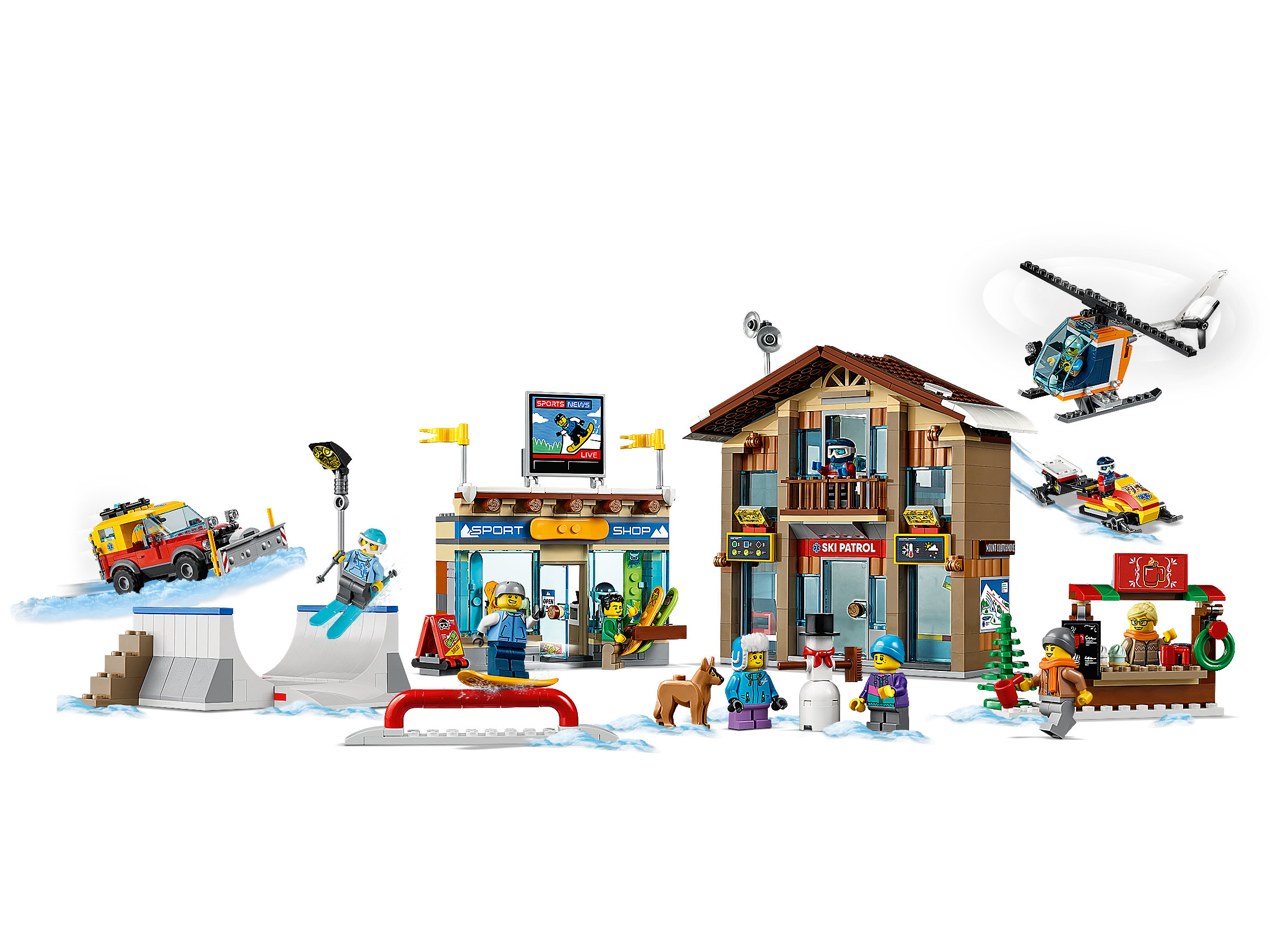 Enthält 11 LEGO® City Minifiguren – 3 Mitglieder der Skipatrouille, einen Ski-Shop-Verkäufer, einen Hubschrauberpiloten, einen Skiläufer, einen Snowboarder, 2 Kinder, einen Getränkeverkäufer und einen Kunden – sowie eine Hundefigur und eine Schneemannfigur zum Zusammenbauen.