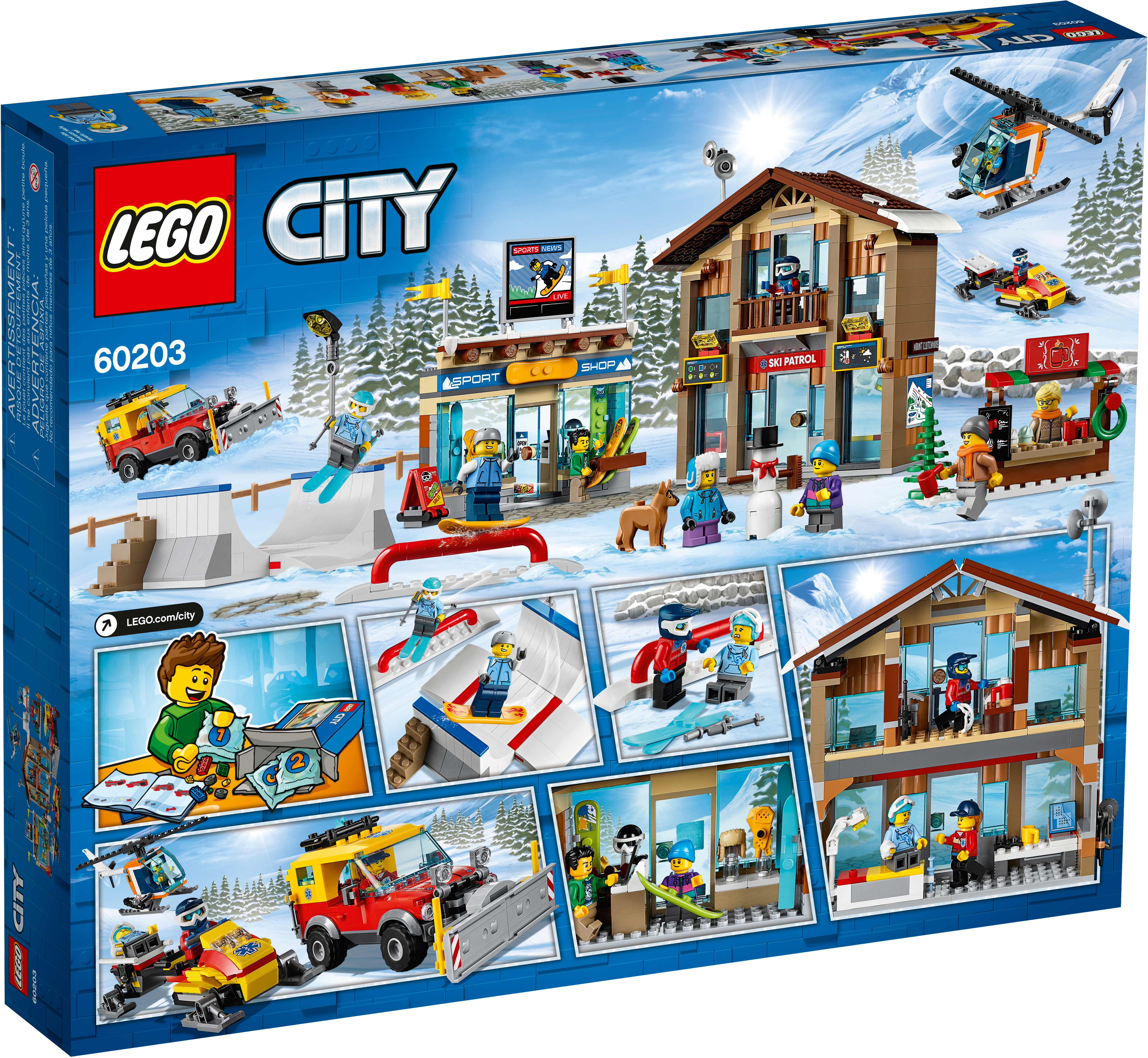 Mit diesem vielfältigen Winterset erwartet alle kleinen Sportler ein aufregendes Abenteuer. Das coole LEGO® City Set „Ski-Resort“ (60203) umfasst eine zweistöckige Rettungsstation, einen Ski-Shop mit großem Bildschirm sowie Snowboard- und Ski-Regal und einen Stand mit heißen Getränken und Cupcakes. Außerdem gibt es einen coolen Schneepark mit Flutlichtmast, Halfpipe und Rail. Dieses großartige Bauset für Kinder enthält außerdem einen Allrad-Truck mit beweglichem Schneepflug, ein Schneemobil mit Anhänger, einen Hubschrauber mit aufklappbarem Cockpit, drehbaren Rotoren und einer Kamera sowie 11 Minifiguren, eine Hundefigur und eine Schneemannfigur zum Zusammenbauen.