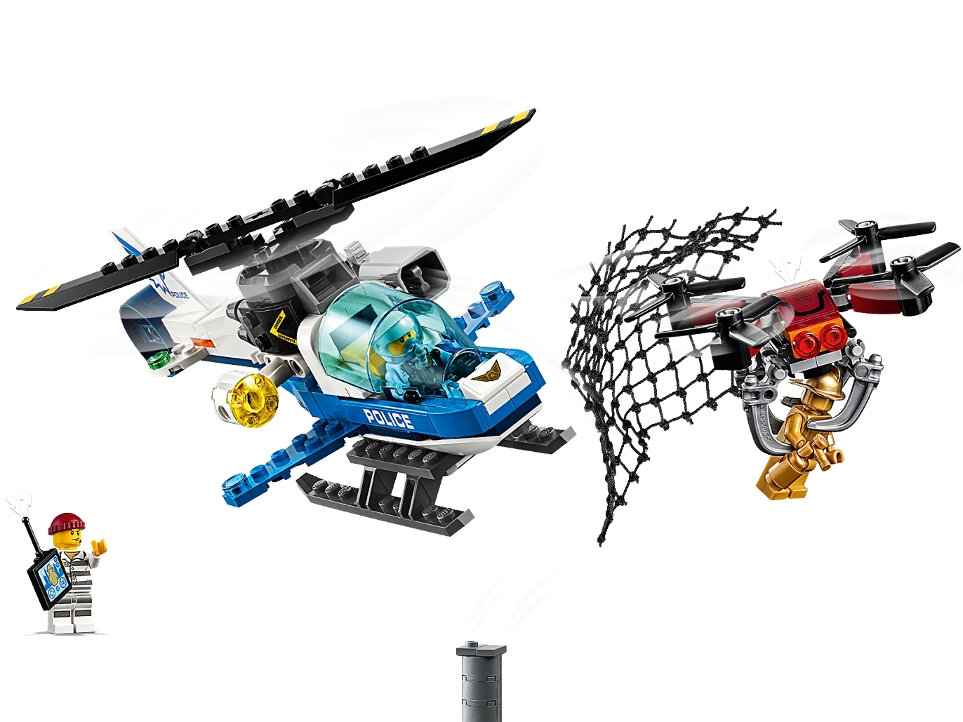 Betätige den Stößel, um das Netz aus der Netzkanone zu katapultieren, und fange die Drohne ein, bevor sie mit der goldenen Statue entkommt!