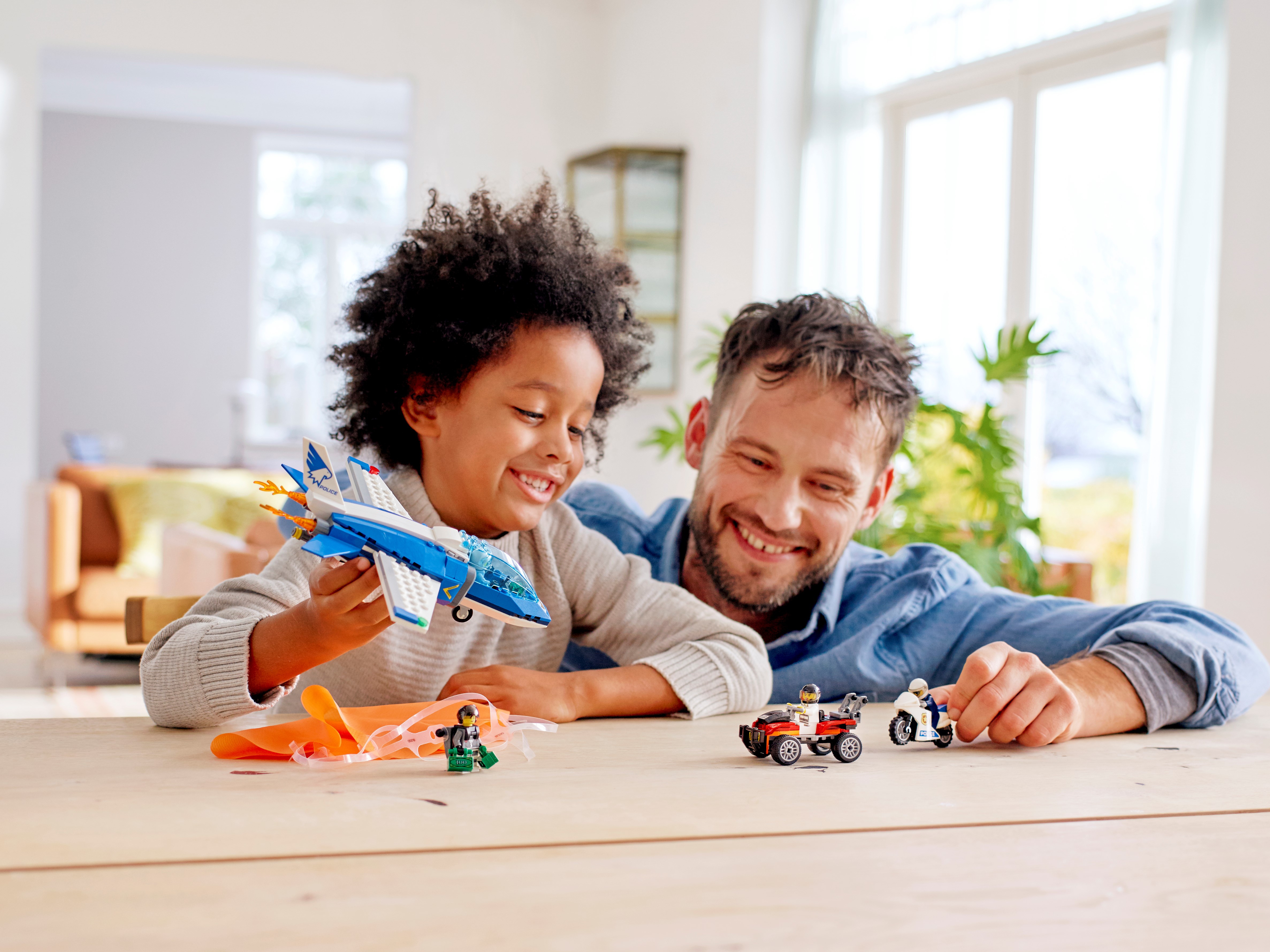 Enthält ein superschnelles Polizeiflugzeug mit Cockpit zum Öffnen für die Minifigur und einen ausfahrbarem Haken zum Fangen des Fallschirms aus beschichtetem Gewebe sowie ein Polizeimotorrad und den Flucht-Buggy der Räuber.
