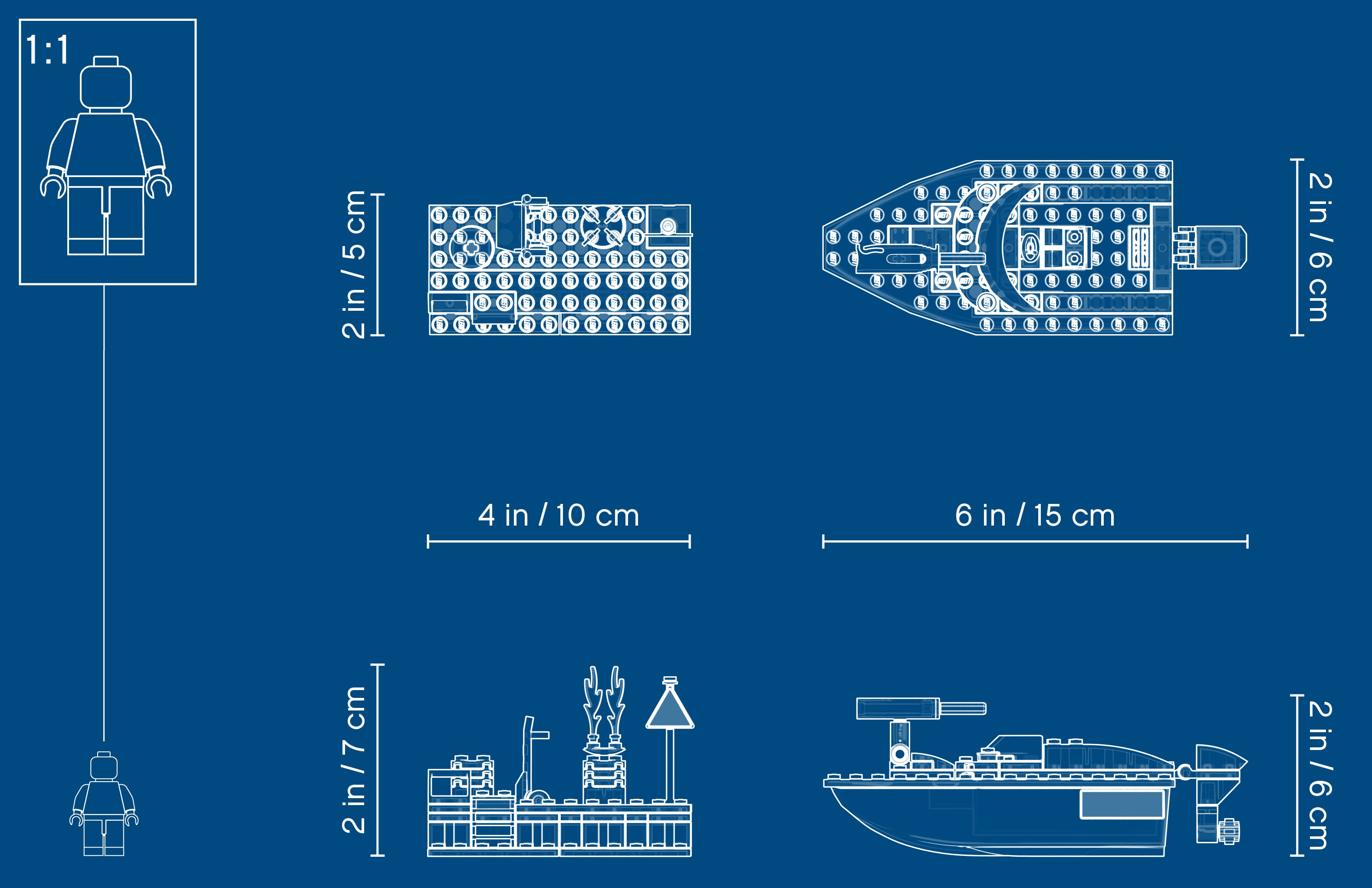 Umfasst ein Feuerwehrboot mit Mehrfachschuss-Wasserkanone (Neuheit ab Januar 2019) und einem hochklappbaren Motor.
