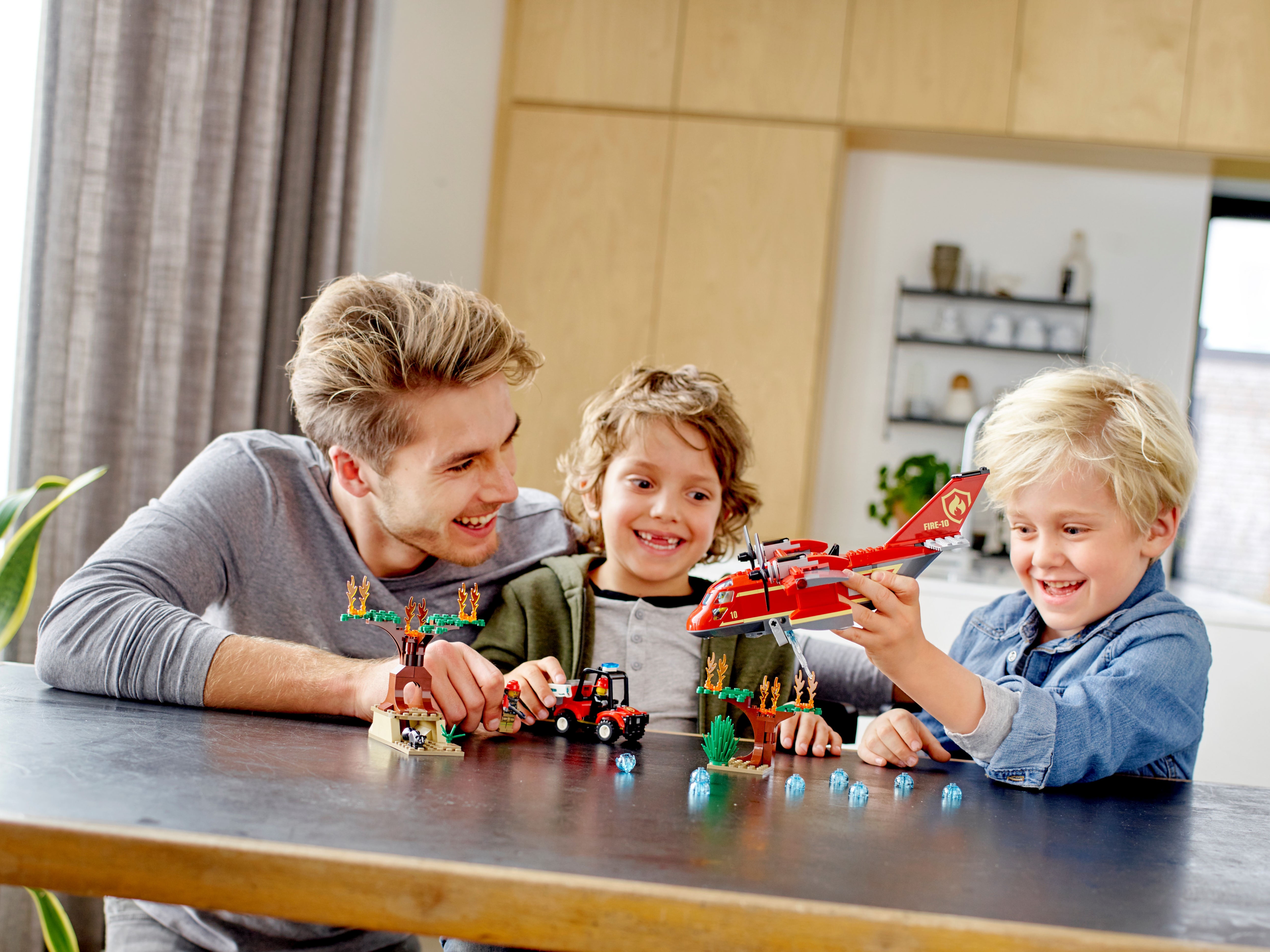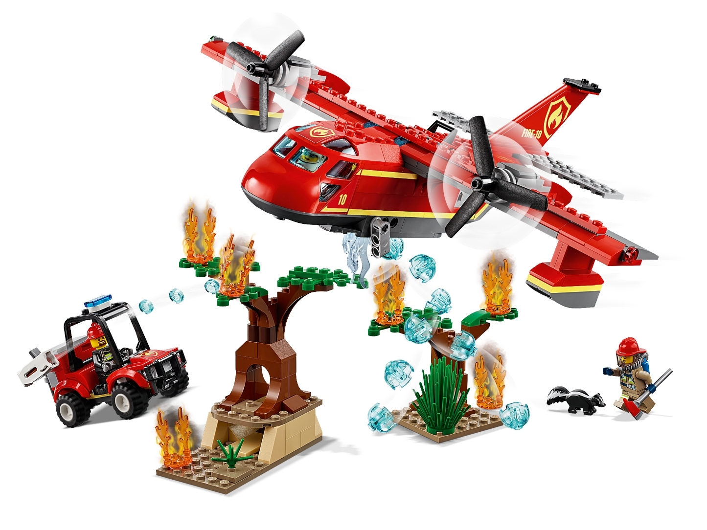 Dieses Waldbrand-Set umfasst ein Löschflugzeug der Feuerwehr mit abnehmbarem Cockpit für Minifiguren, das sich öffnen lässt, drehbaren Propellern und Klappen zum Öffnen an der Ober- und Unterseite, sowie einen Feuerwehr-Buggy mit Shooter für drei Noppen (Neuheit Januar 2019) und Überrollkäfig.