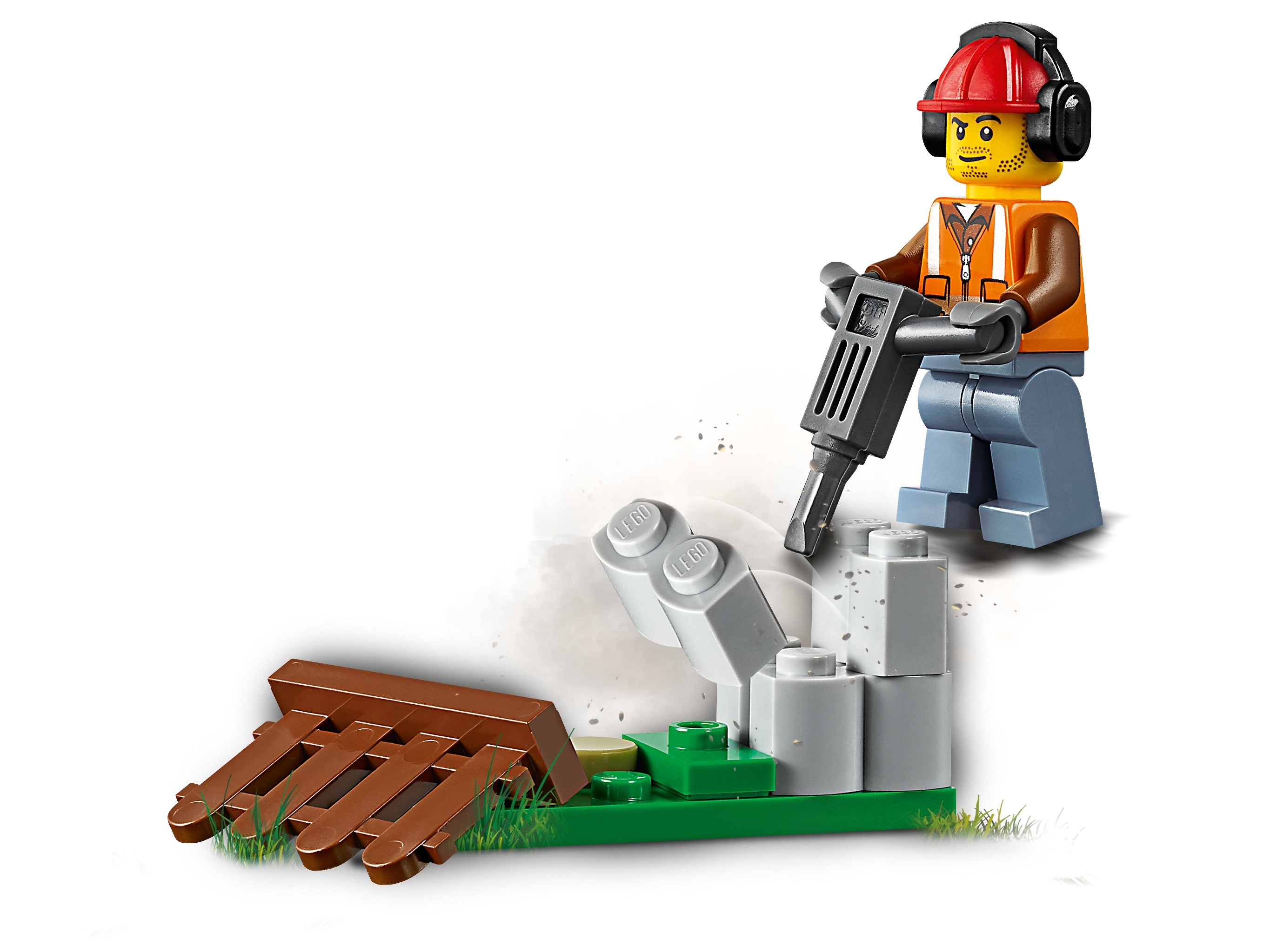 • Als Zubehör sind ein Presslufthammer und eine kleine baubare Szene mit Zaun und Betonstapel enthalten.