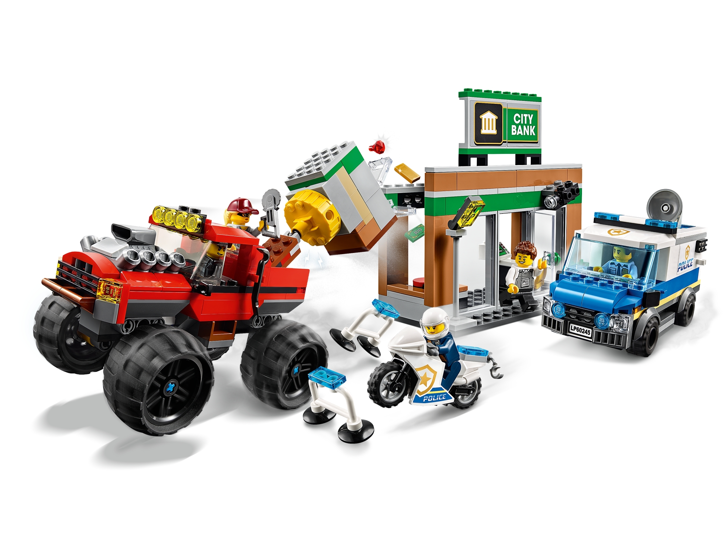 Der Polizei-Überwachungsvan und das Bankgebäude verfügen über eine detailreiche Innenausstattung. Kinder den können den Tresor mit dem Magnetarm des Monster-Trucks aus der Mauer ziehen. Das Set lässt sich auch mit anderen LEGO® Sets kombinieren.
