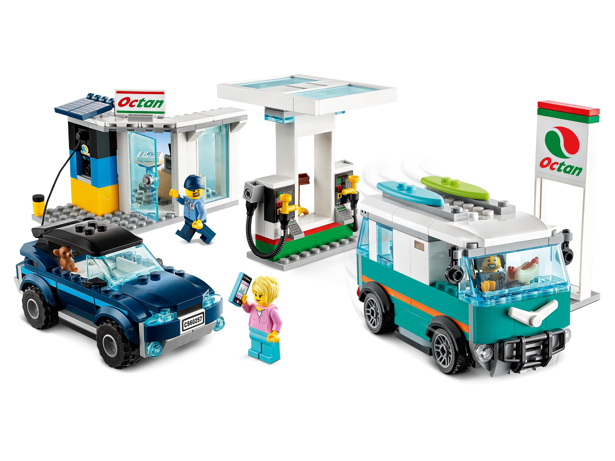 Die LEGO® City Tankstelle (60257) enthält eine Zapfsäule und eine Ladestation. Der Elektro-SUV lässt sich an die Ladesäule anschließen, der Campingbus kann an der Zapfsäule vollgetankt werden, und im Shop gibt es Süßigkeiten. Der Tankwart, der Autofahrer und die beiden Surfer sowie die Chihuahua-Figur bieten unbegrenzte Spielmöglichkeiten.