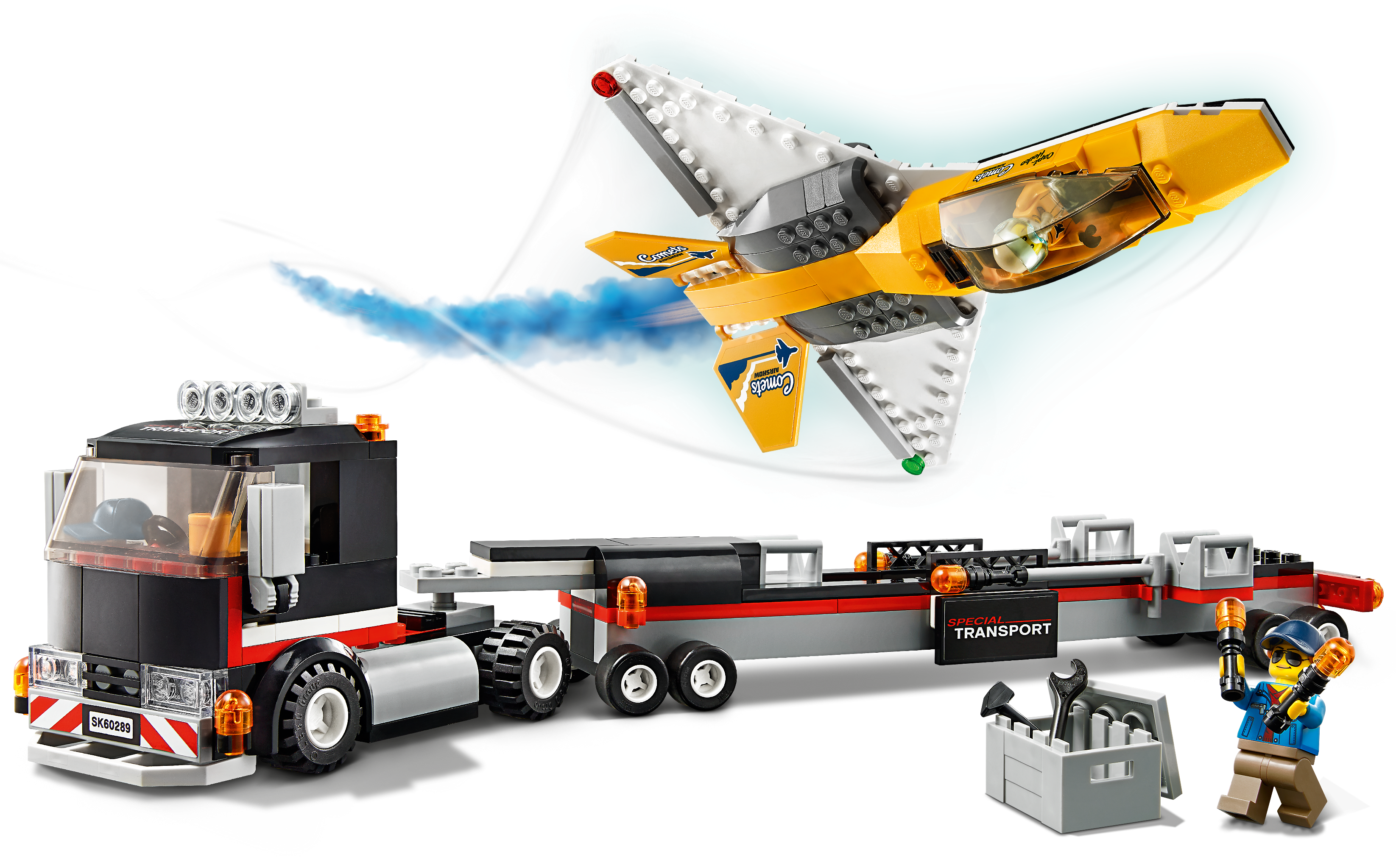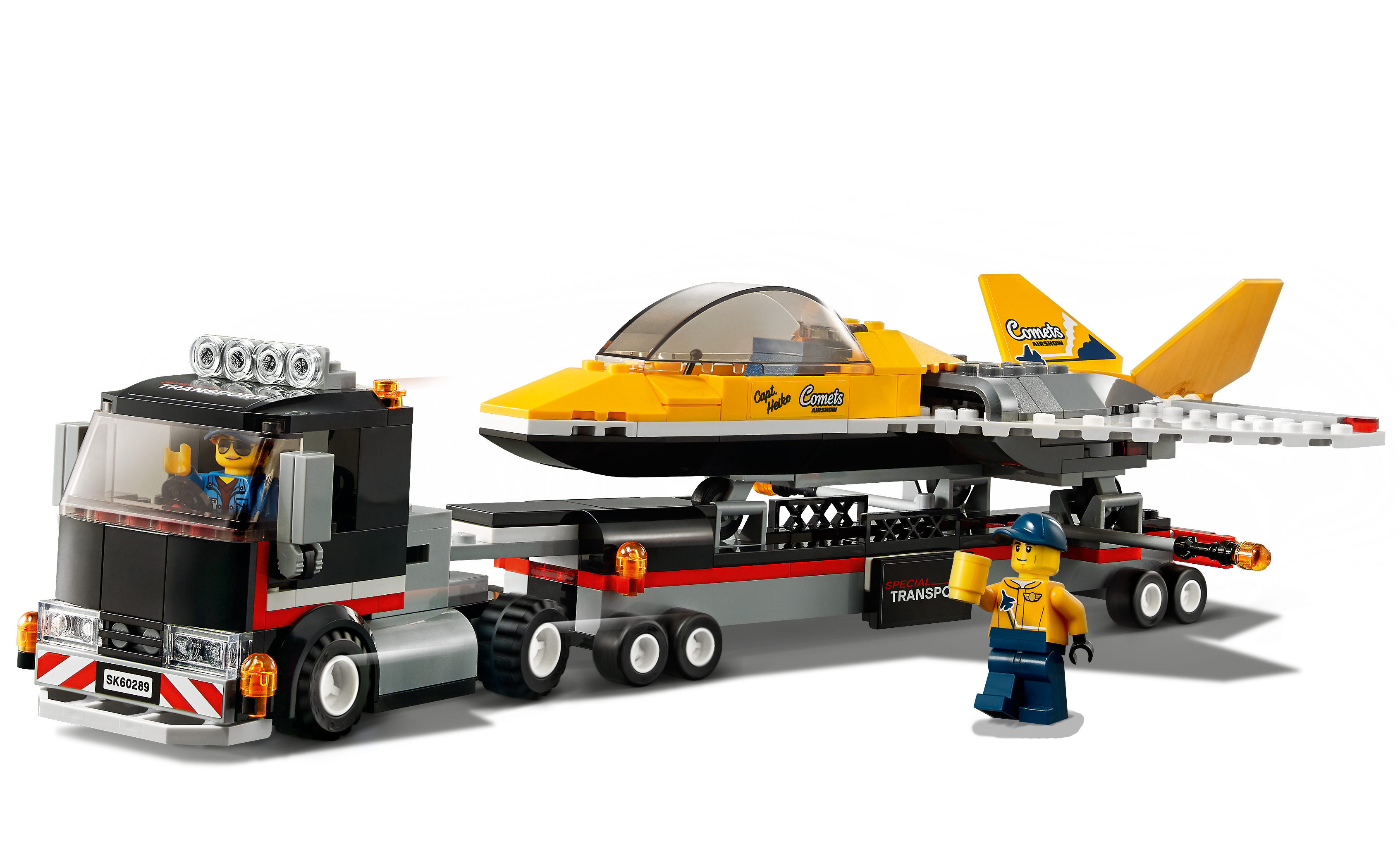 Das beeindruckende Bauset enthält einen Sattelschlepper mit Sitz für die Fahrer-Minifigur sowie einen starken Jet mit verstellbaren Heckflügeln und getöntem Minifigur-Cockpit.