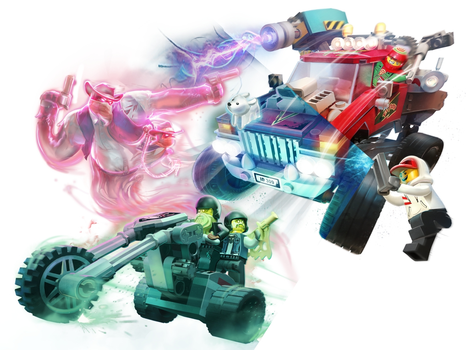 • Dieses einzigartige Spielzeug umfasst einen Stunt-Truck mit Hinterradfederung, Platz für 2 Minifiguren und an der Rückseite montierte Spielzeug-Kanonen sowie ein tolles 3-rädriges Chopper-Motorrad mit Platz für 2 Minifiguren.